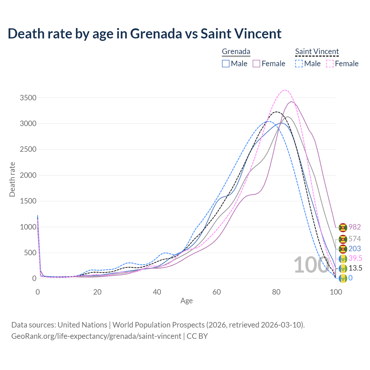 In Grenada, the most common age of death is 84, compared to 80 in Saint Vincent. The median age of death is 79.3 in Grenada and 75.6 in Saint Vincent, meaning only half of each cohort is expected to live past that age.