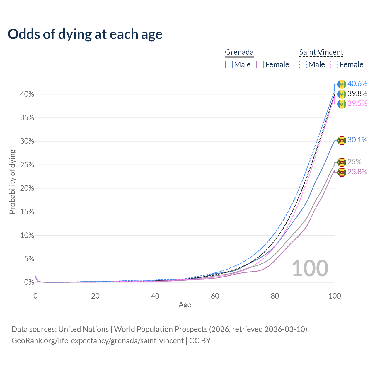 This life expectancy calculator shows the odds of living to 100, 95, 90, and below based on current age for both males and females in Grenada and Saint Vincent, along with mean and median age of death. The calculations are based on the 2026 life tables (actuarial tables) from the UN World Population Prospects.