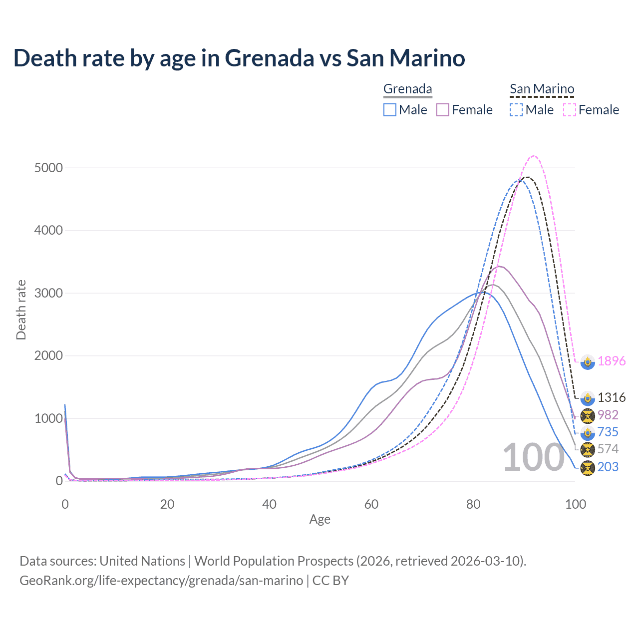 In Grenada, the most common age of death is 84, compared to 91 in San Marino. The median age of death is 79.3 in Grenada and 88.3 in San Marino, meaning only half of each cohort is expected to live past that age.