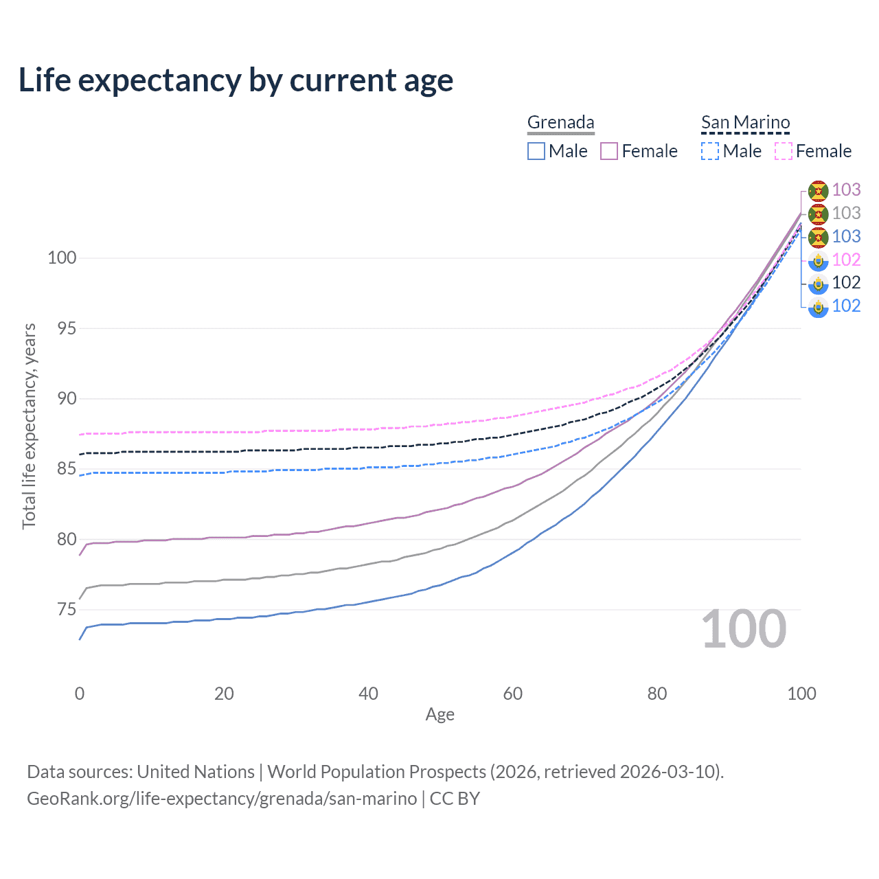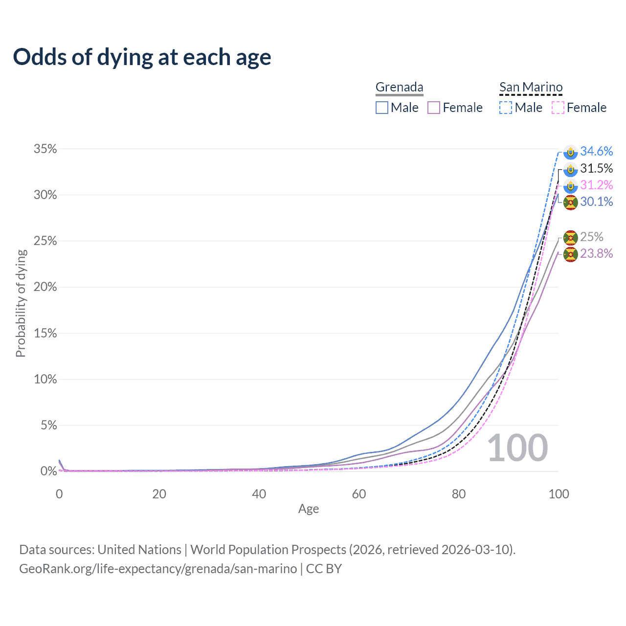 This life expectancy calculator shows the odds of living to 100, 95, 90, and below based on current age for both males and females in Grenada and San Marino, along with mean and median age of death. The calculations are based on the 2026 life tables (actuarial tables) from the UN World Population Prospects.