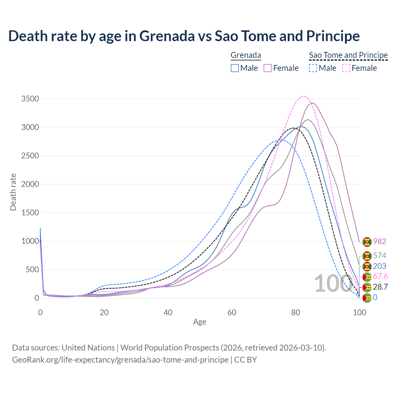 In Grenada, the most common age of death is 84, compared to 79 in Sao Tome and Principe. The median age of death is 79.3 in Grenada and 74.1 in Sao Tome and Principe, meaning only half of each cohort is expected to live past that age.