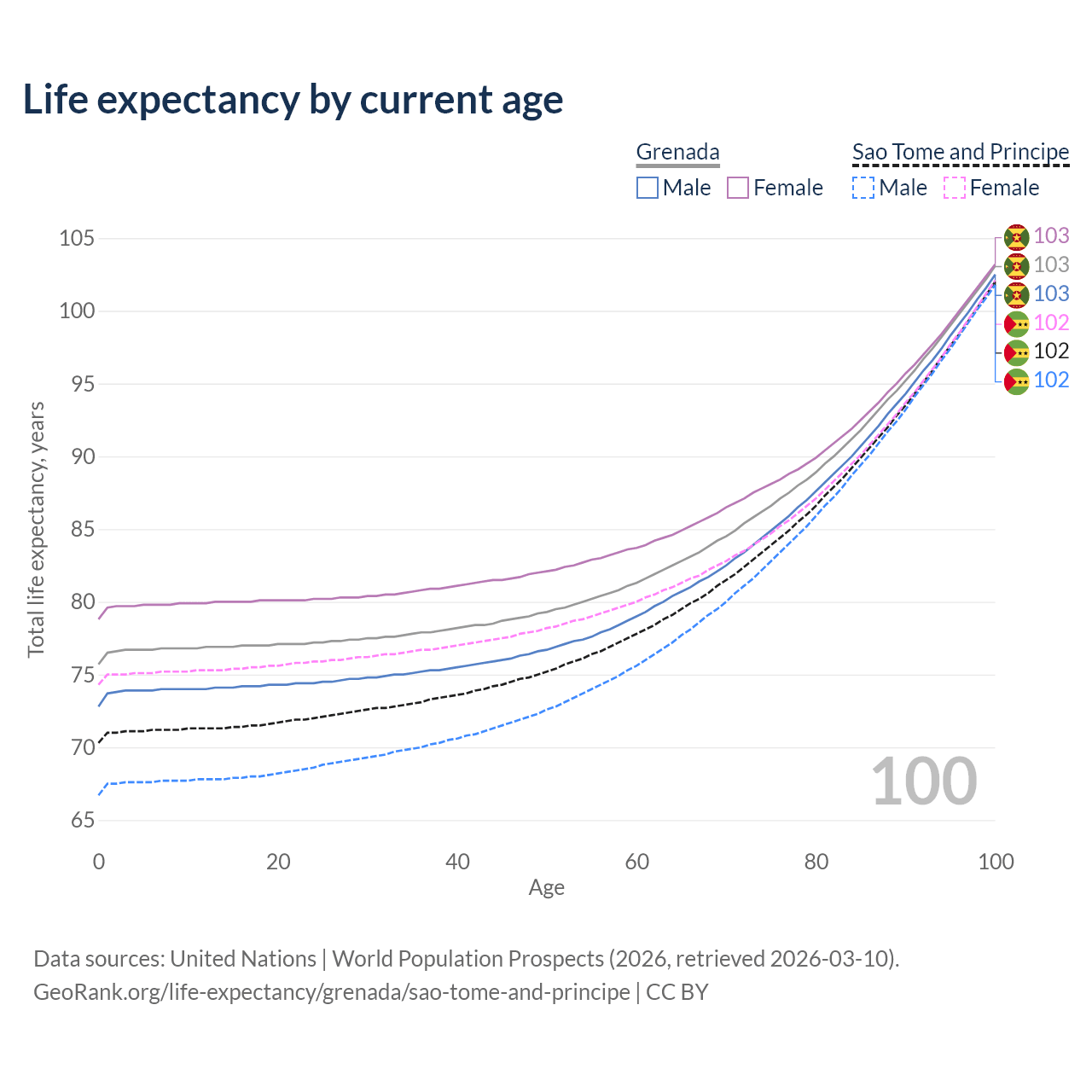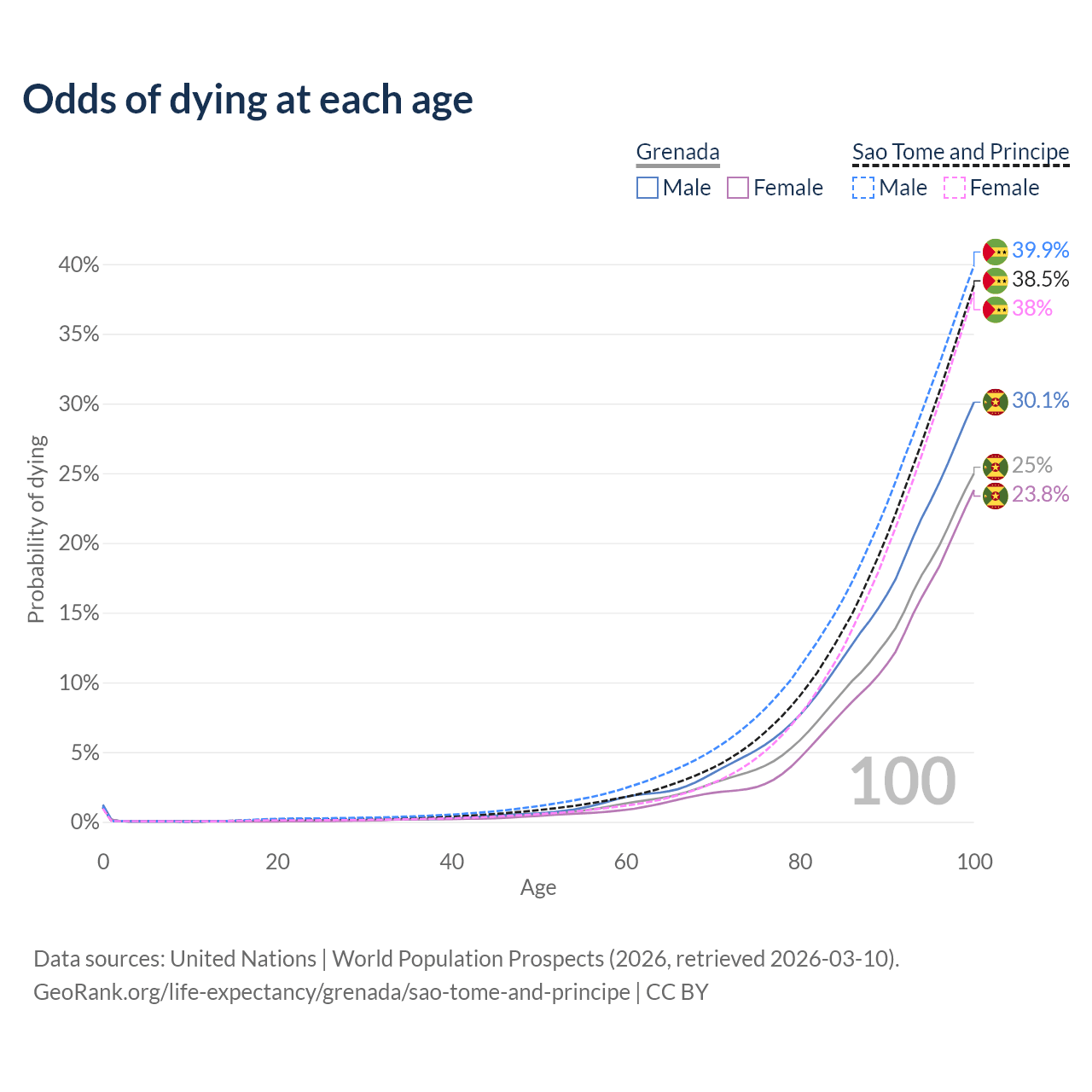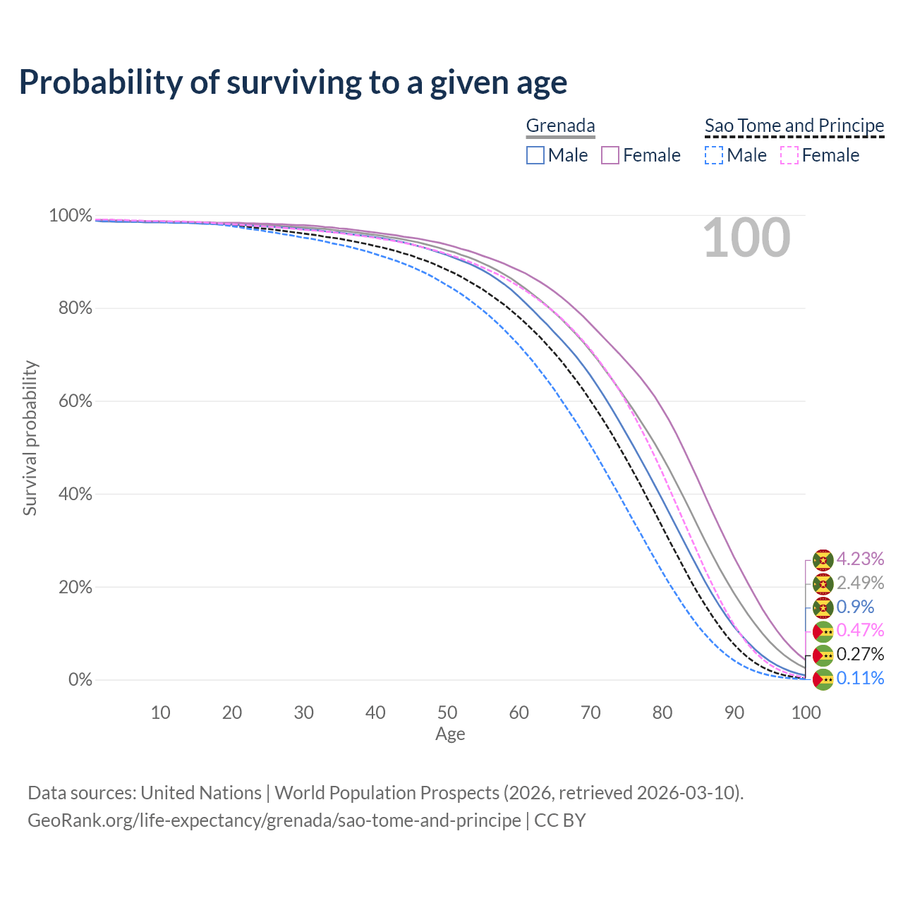 This life expectancy calculator shows the odds of living to 100, 95, 90, and below based on current age for both males and females in Grenada and Sao Tome and Principe, along with mean and median age of death. The calculations are based on the 2026 life tables (actuarial tables) from the UN World Population Prospects.