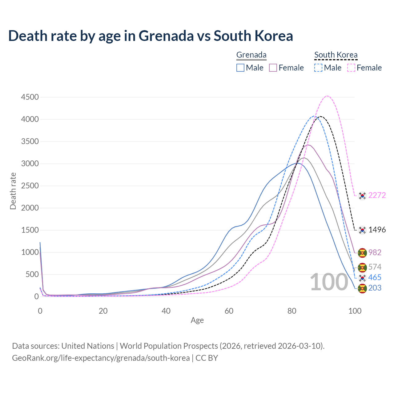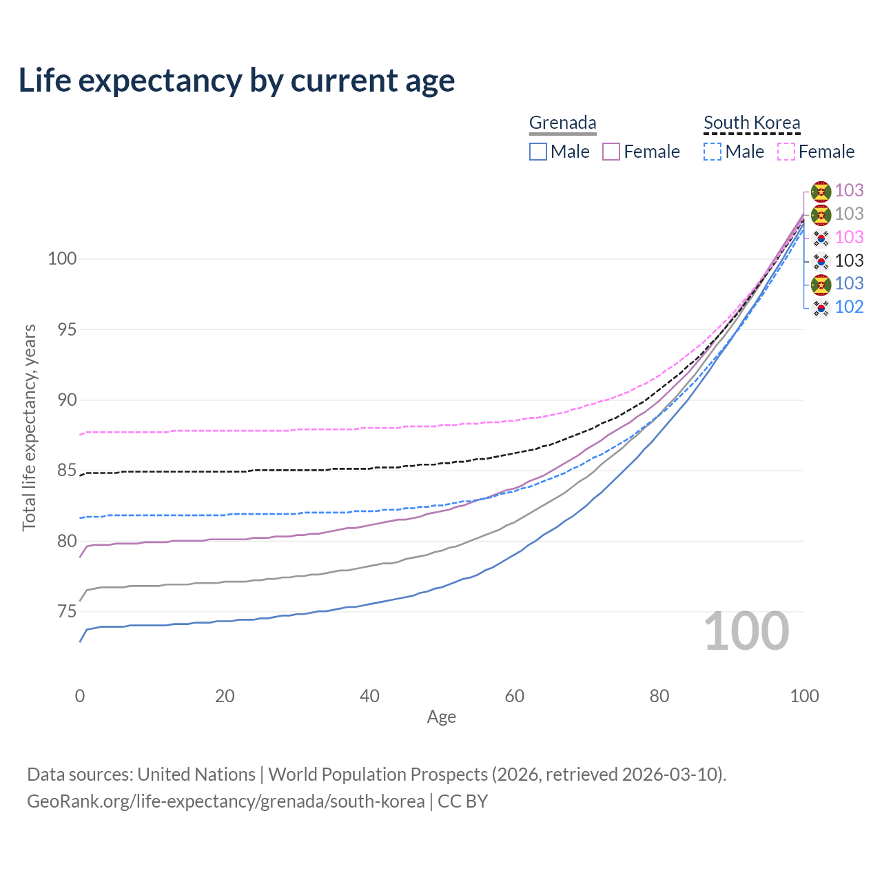 This life expectancy calculator shows the odds of living to 100, 95, 90, and below based on current age for both males and females in Grenada and South Korea, along with mean and median age of death. The calculations are based on the 2026 life tables (actuarial tables) from the UN World Population Prospects.