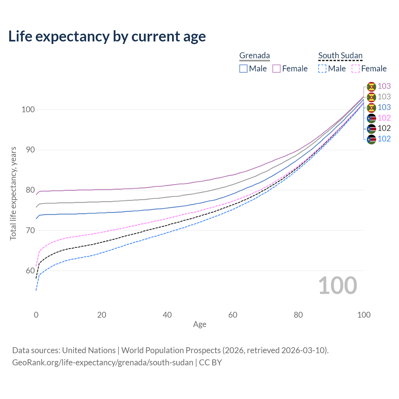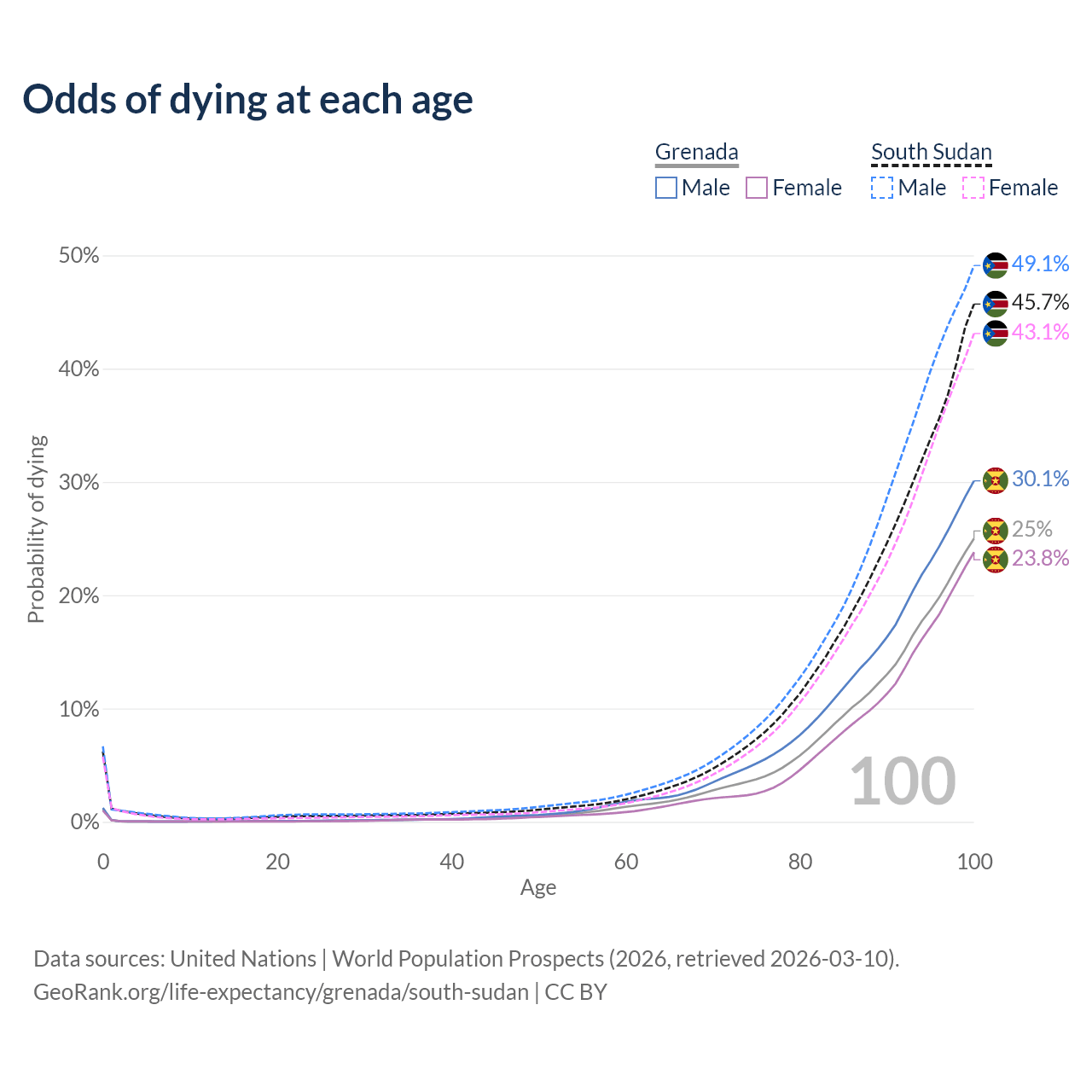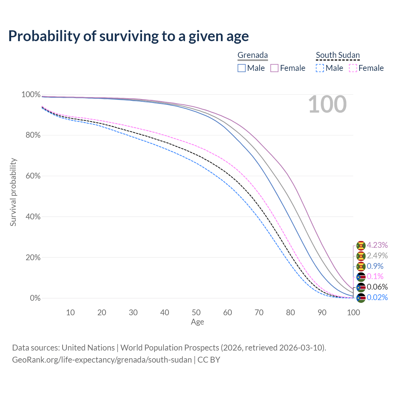 This life expectancy calculator shows the odds of living to 100, 95, 90, and below based on current age for both males and females in Grenada and South Sudan, along with mean and median age of death. The calculations are based on the 2026 life tables (actuarial tables) from the UN World Population Prospects.