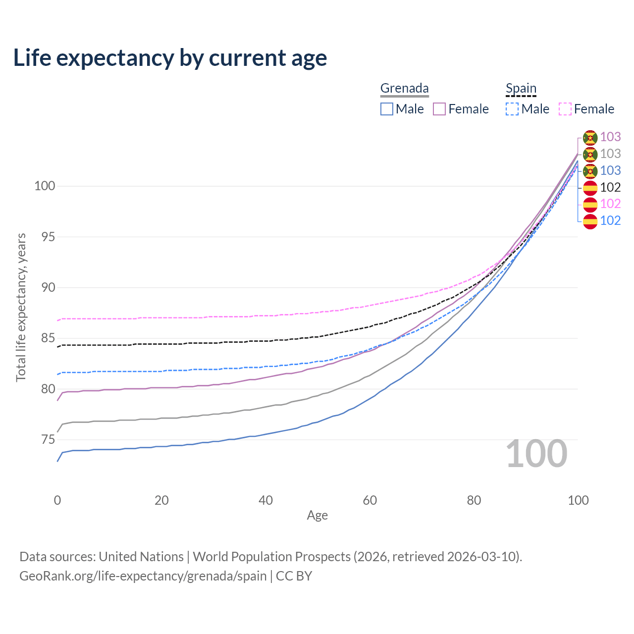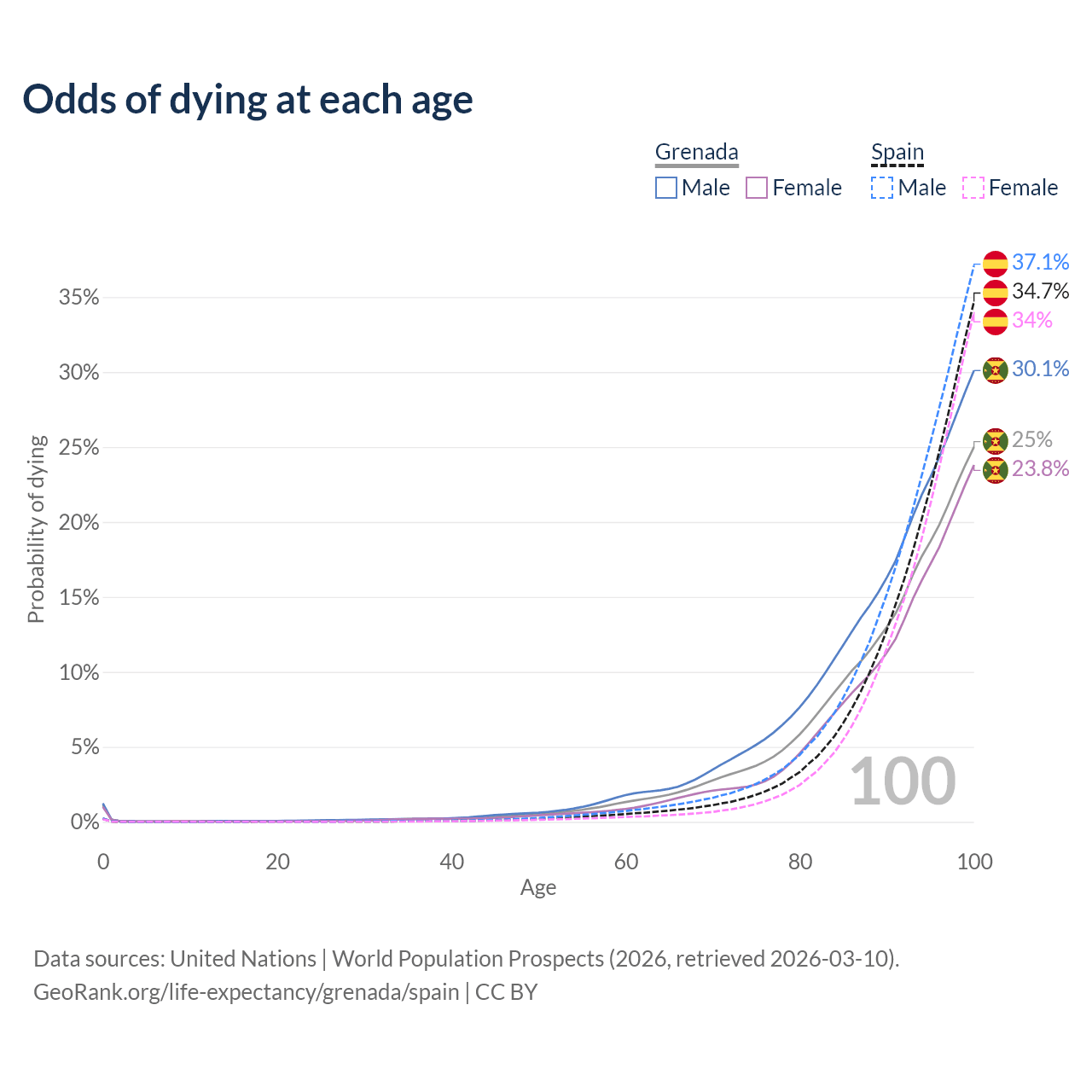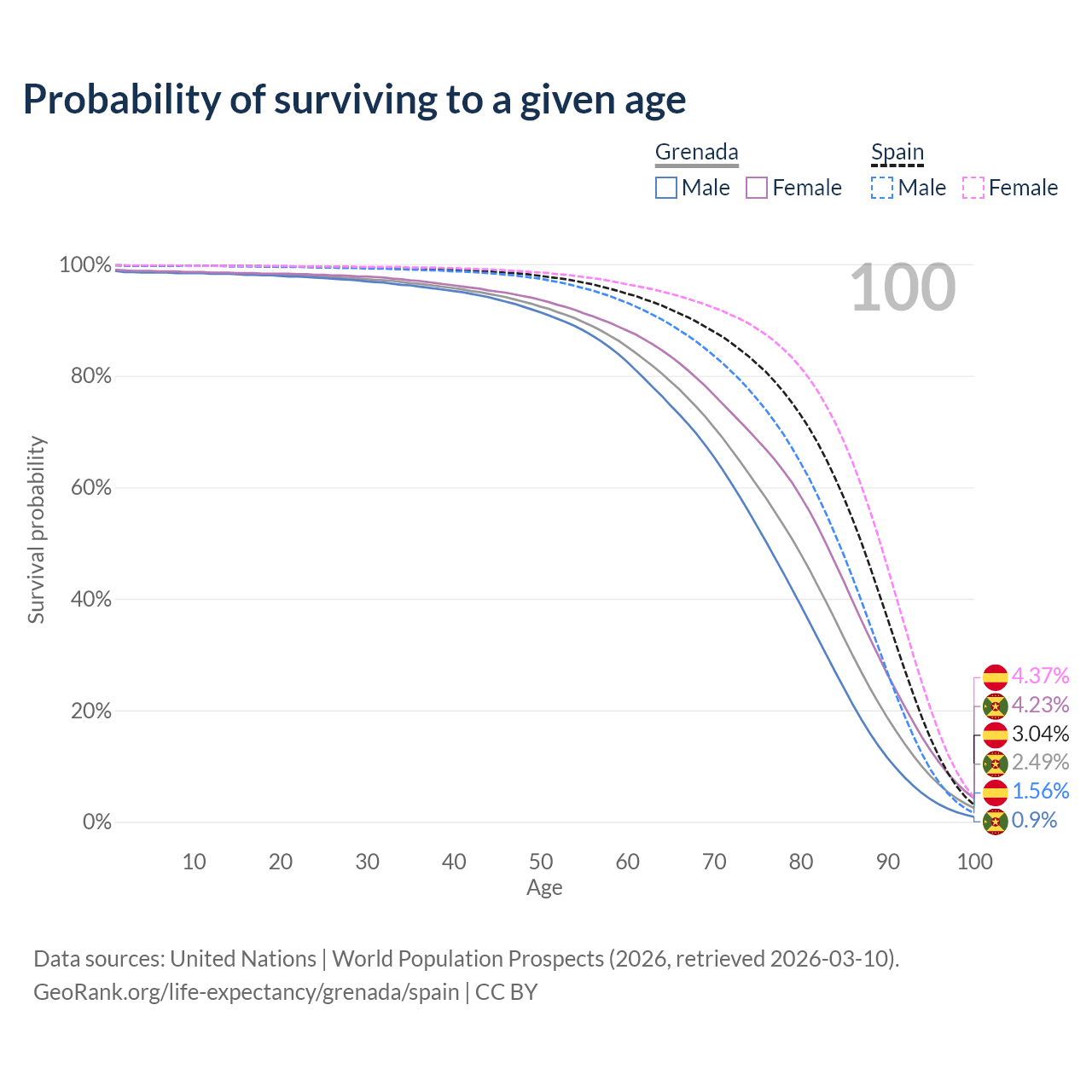 This life expectancy calculator shows the odds of living to 100, 95, 90, and below based on current age for both males and females in Grenada and Spain, along with mean and median age of death. The calculations are based on the 2026 life tables (actuarial tables) from the UN World Population Prospects.