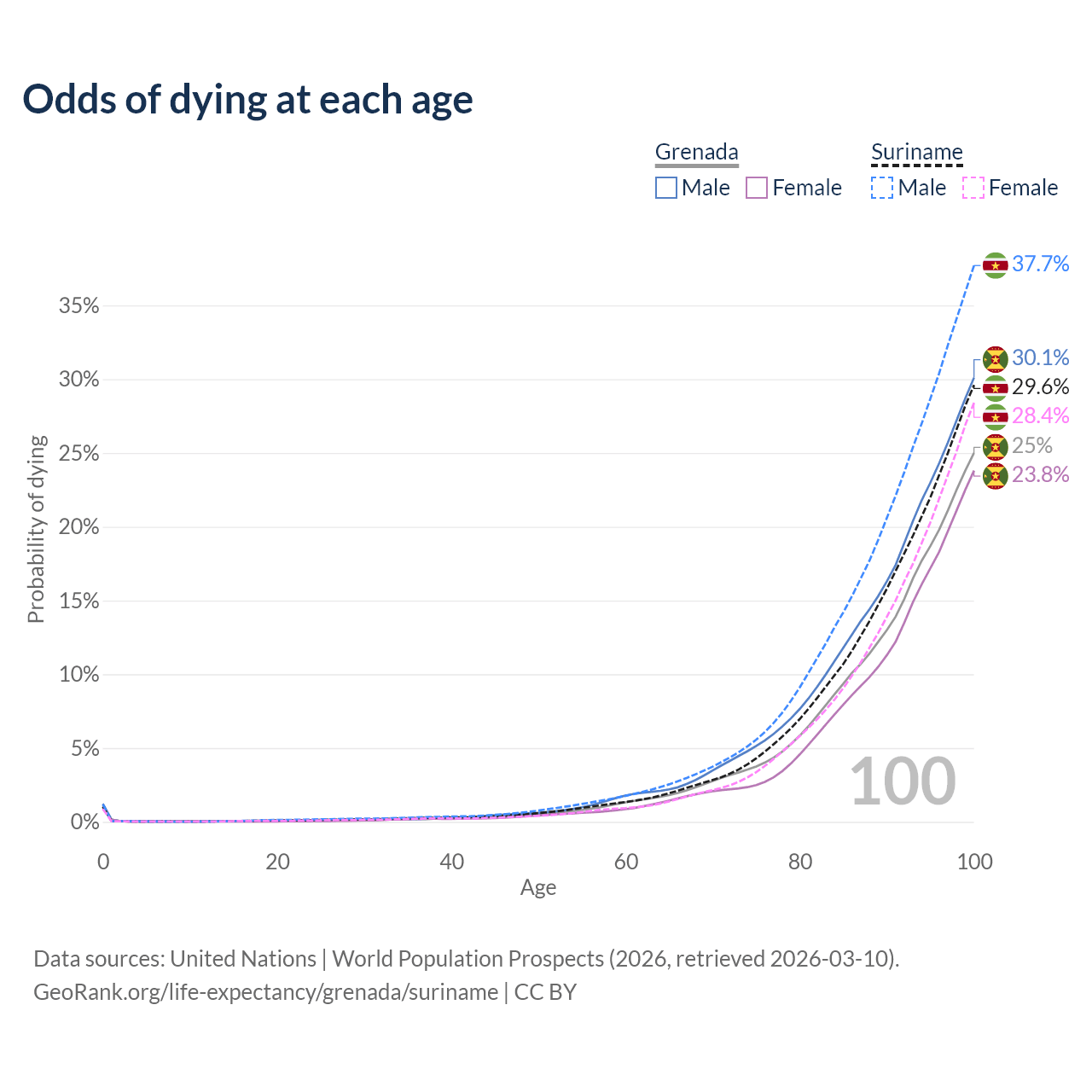 This life expectancy calculator shows the odds of living to 100, 95, 90, and below based on current age for both males and females in Grenada and Suriname, along with mean and median age of death. The calculations are based on the 2026 life tables (actuarial tables) from the UN World Population Prospects.