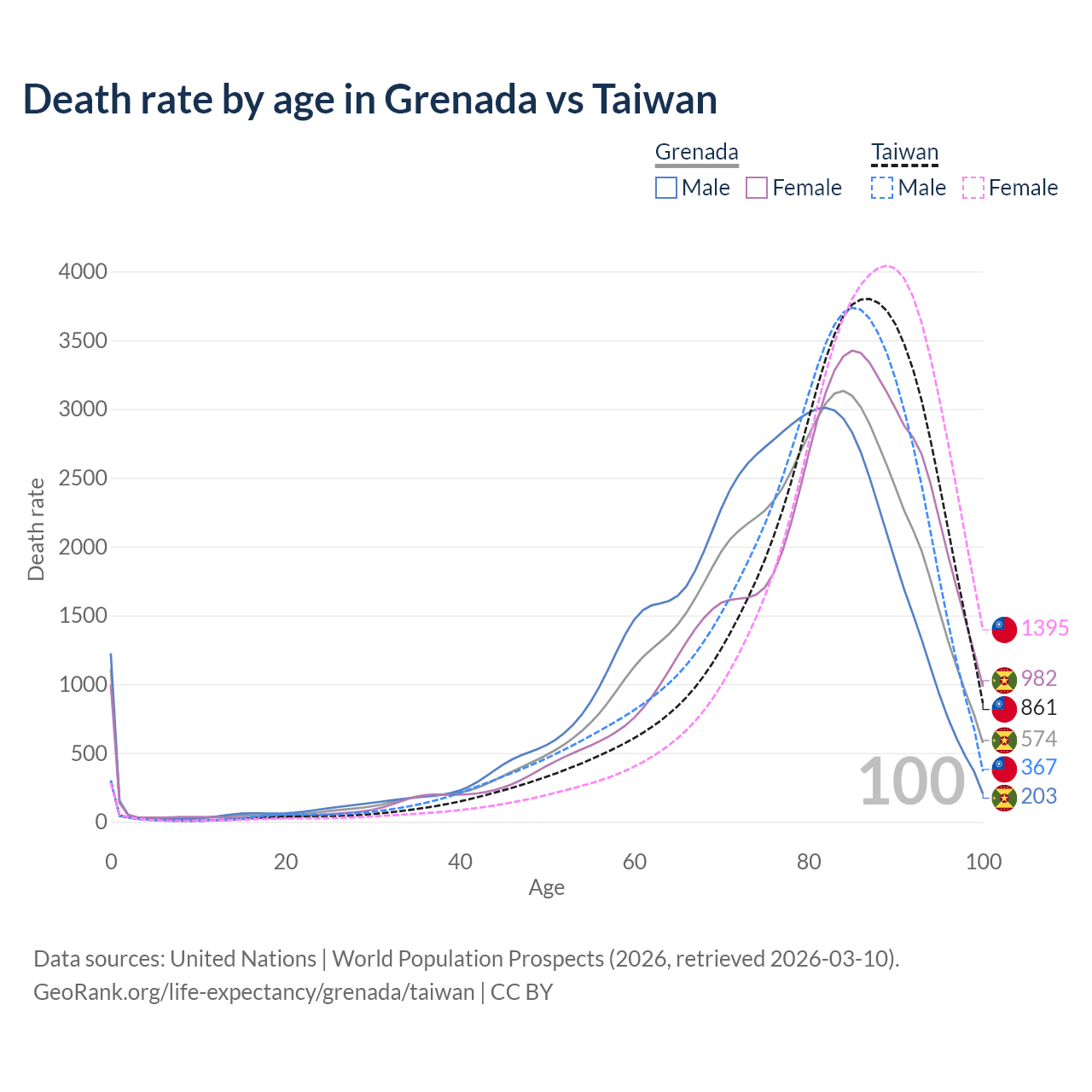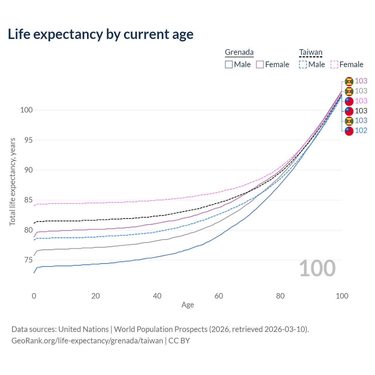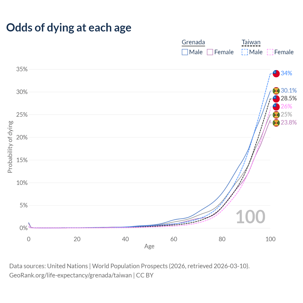 This life expectancy calculator shows the odds of living to 100, 95, 90, and below based on current age for both males and females in Grenada and Taiwan, along with mean and median age of death. The calculations are based on the 2026 life tables (actuarial tables) from the UN World Population Prospects.