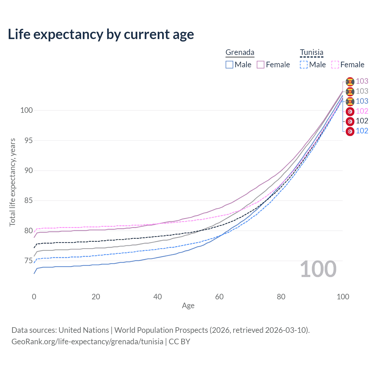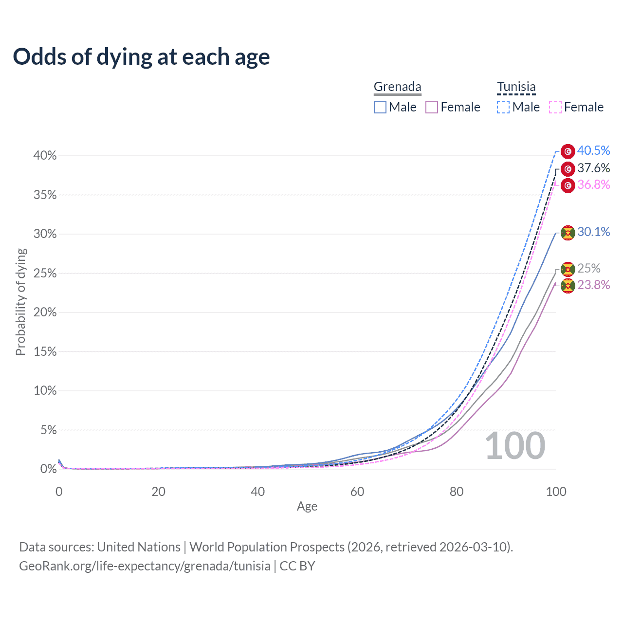 This life expectancy calculator shows the odds of living to 100, 95, 90, and below based on current age for both males and females in Grenada and Tunisia, along with mean and median age of death. The calculations are based on the 2026 life tables (actuarial tables) from the UN World Population Prospects.