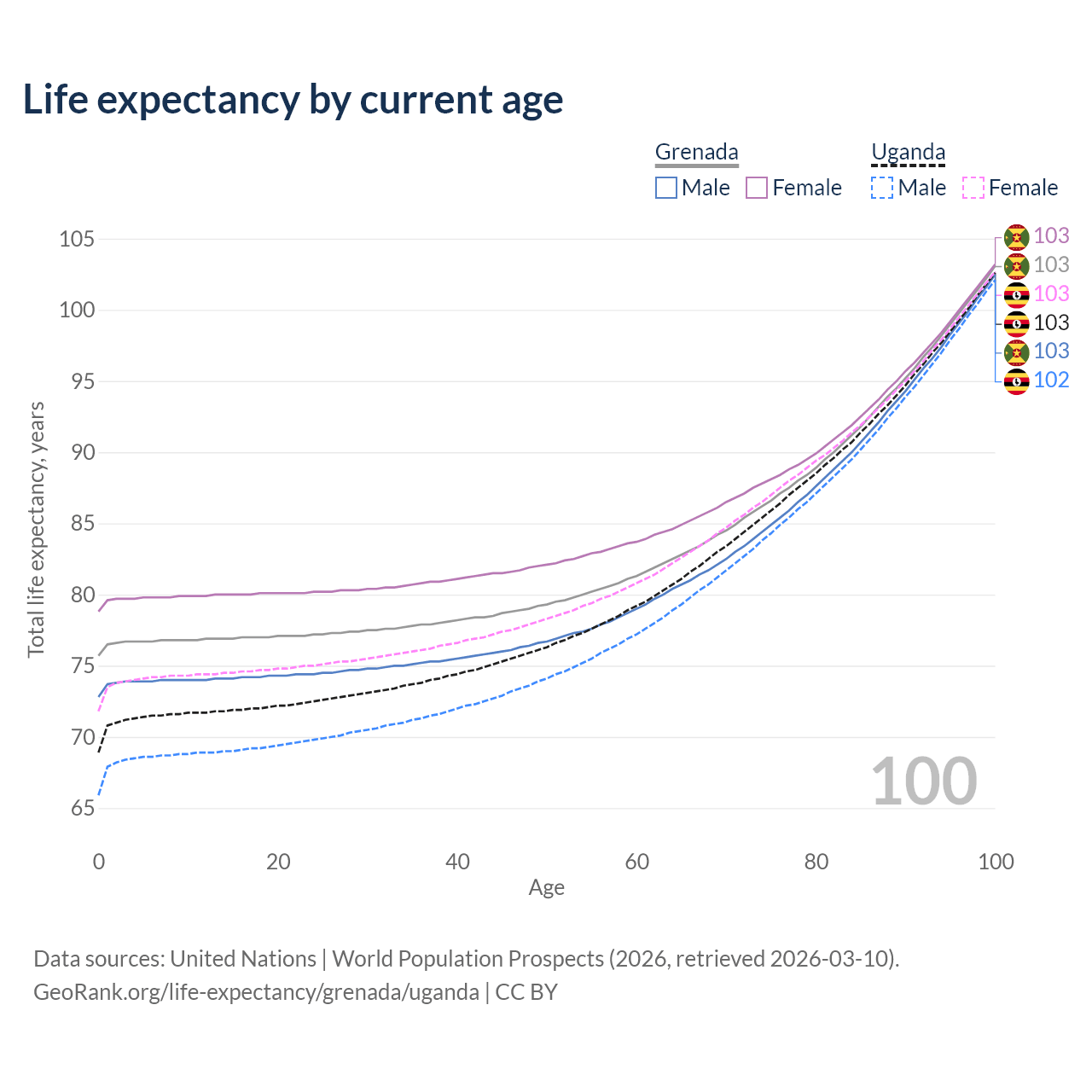 This life expectancy calculator shows the odds of living to 100, 95, 90, and below based on current age for both males and females in Grenada and Uganda, along with mean and median age of death. The calculations are based on the 2026 life tables (actuarial tables) from the UN World Population Prospects.