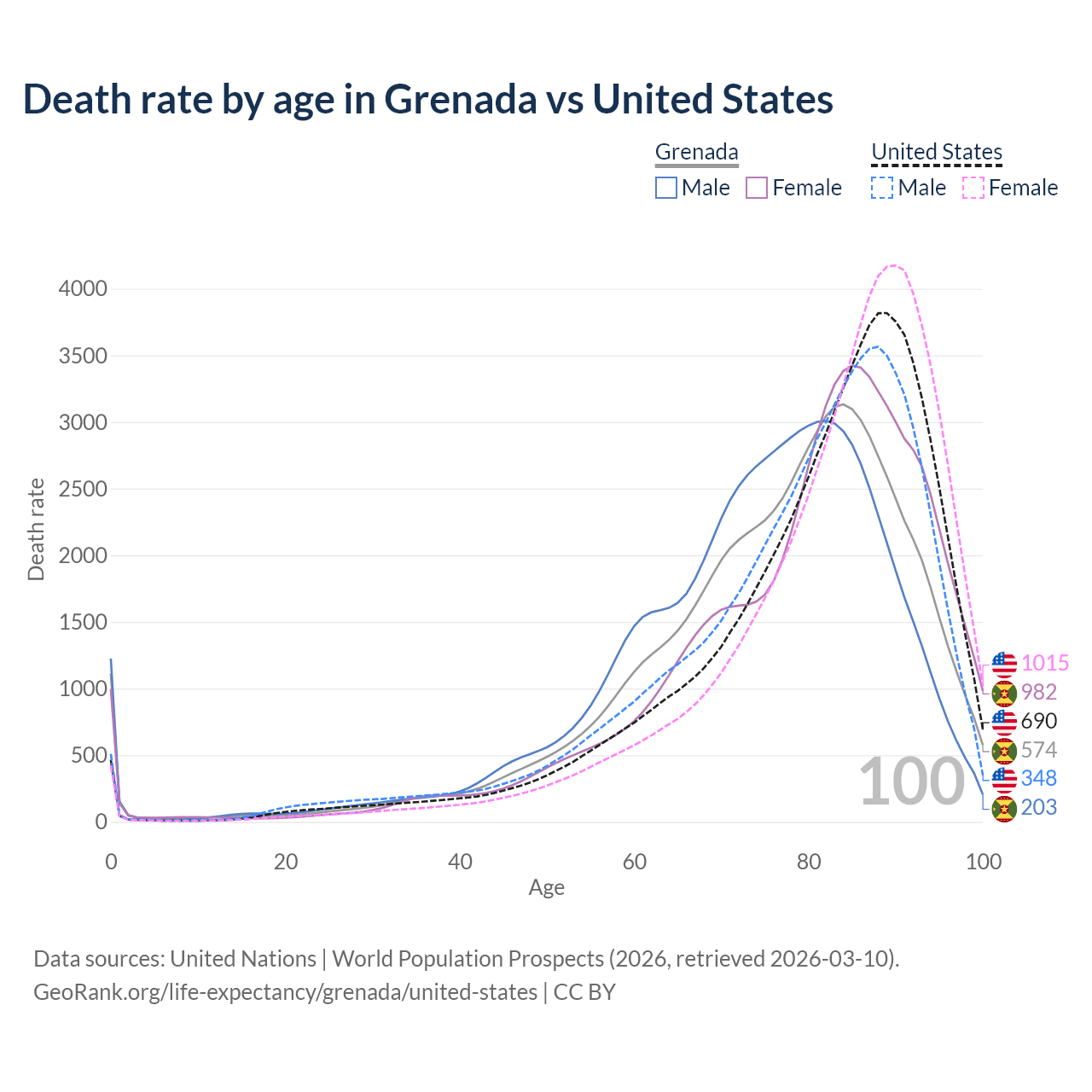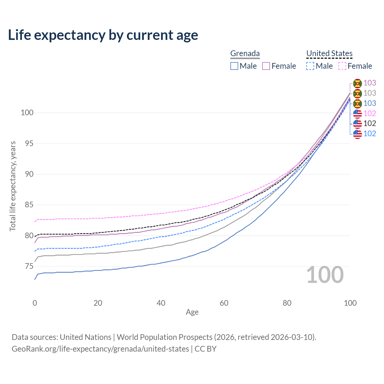 This life expectancy calculator shows the odds of living to 100, 95, 90, and below based on current age for both males and females in Grenada and the United States, along with mean and median age of death. The calculations are based on the 2026 life tables (actuarial tables) from the UN World Population Prospects.