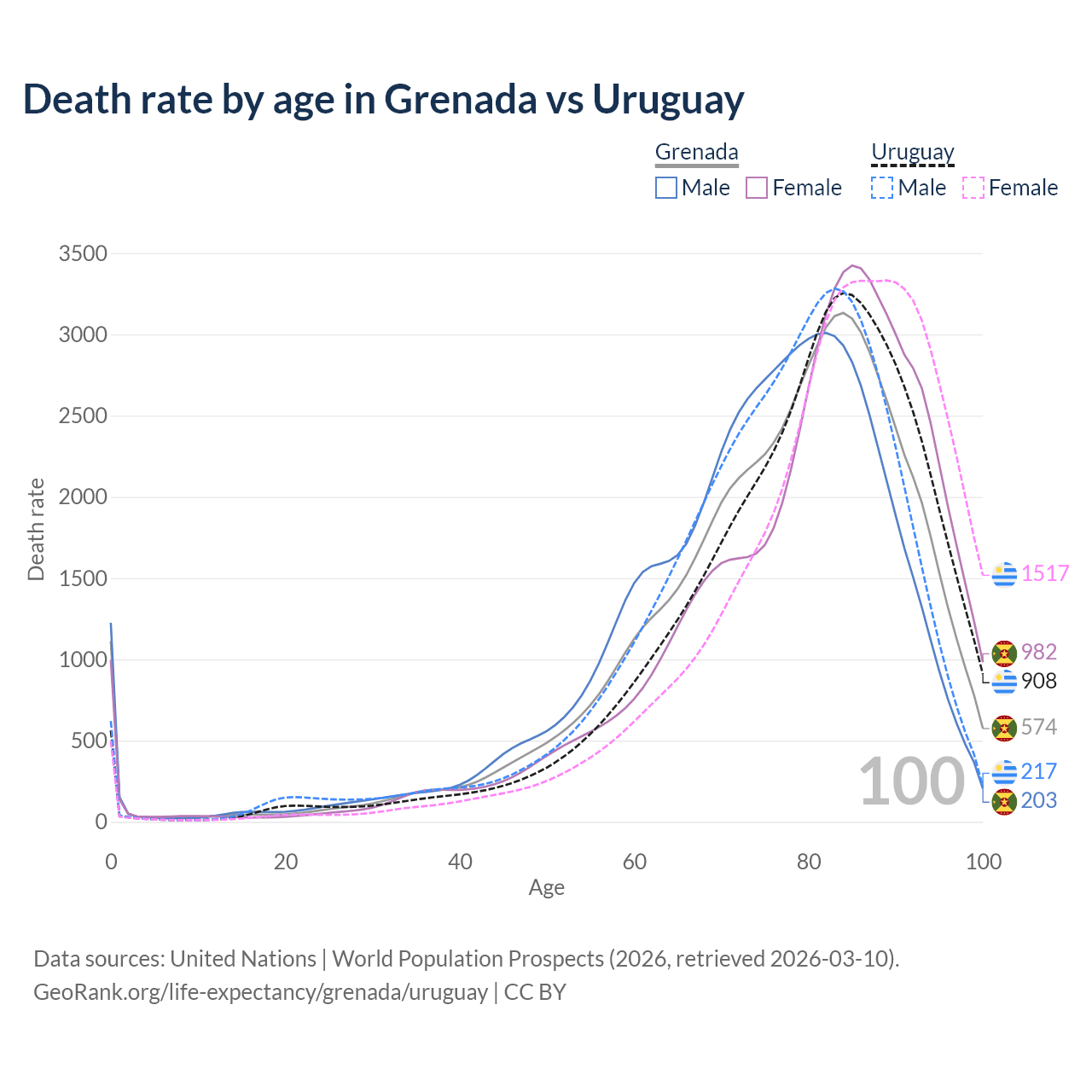 In Grenada, the most common age of death is 84, compared to 84 in Uruguay. The median age of death is 79.3 in Grenada and 81.8 in Uruguay, meaning only half of each cohort is expected to live past that age.