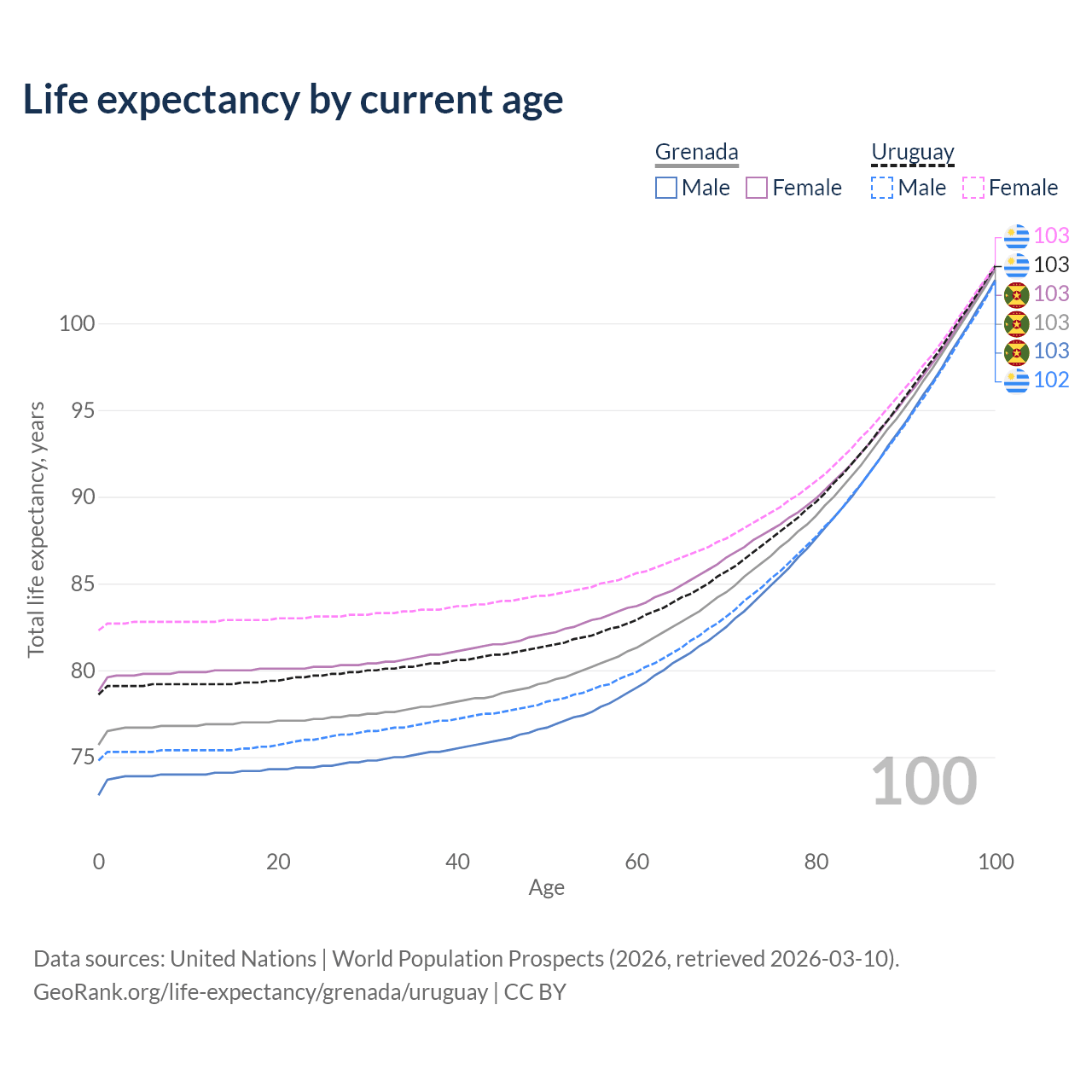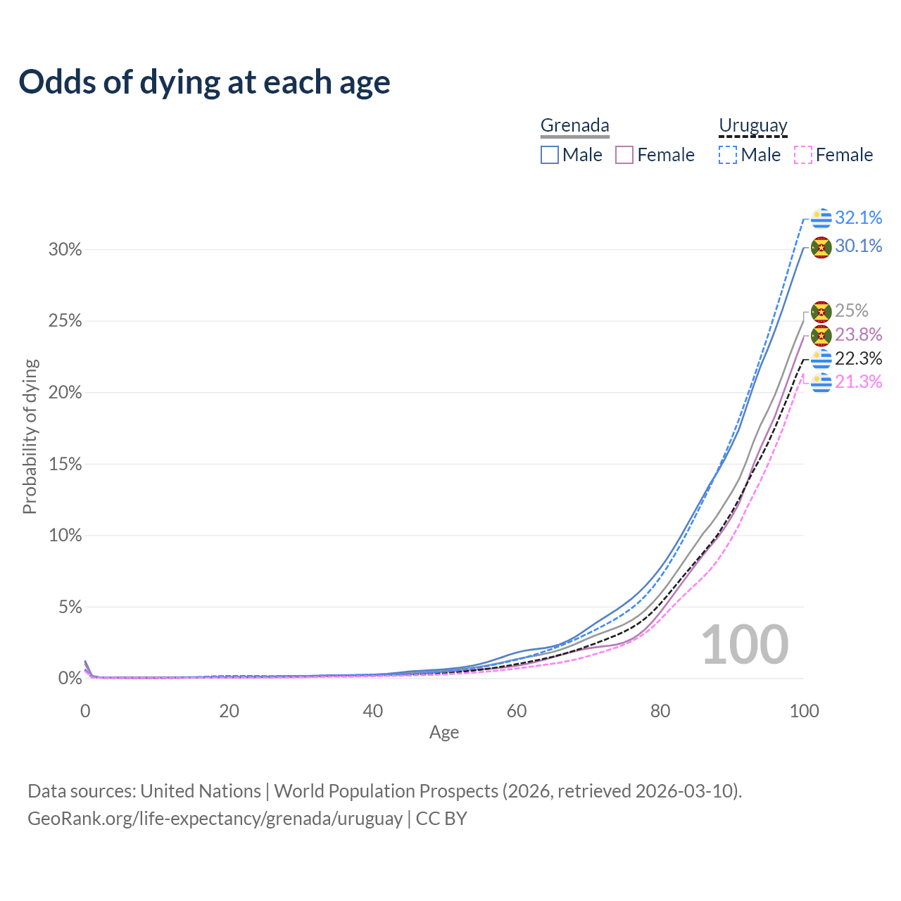 This life expectancy calculator shows the odds of living to 100, 95, 90, and below based on current age for both males and females in Grenada and Uruguay, along with mean and median age of death. The calculations are based on the 2026 life tables (actuarial tables) from the UN World Population Prospects.