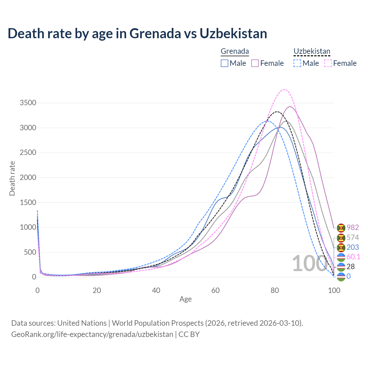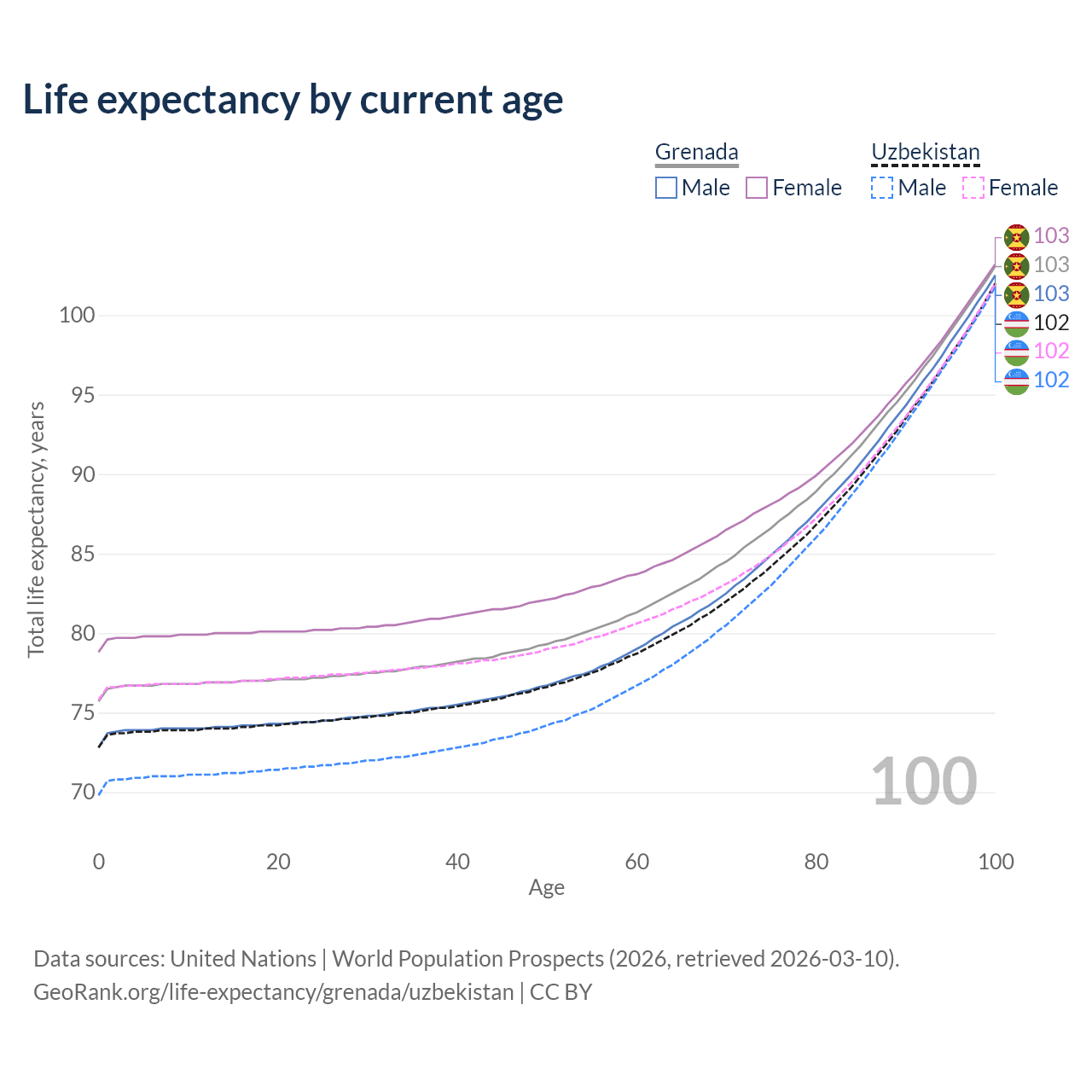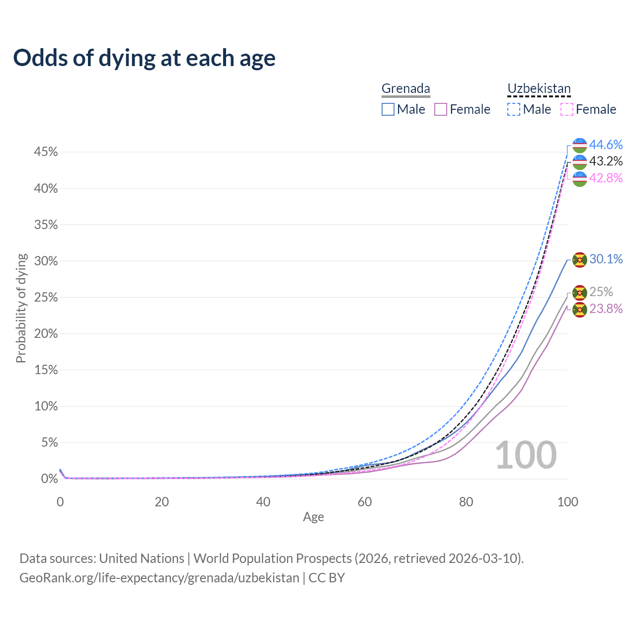This life expectancy calculator shows the odds of living to 100, 95, 90, and below based on current age for both males and females in Grenada and Uzbekistan, along with mean and median age of death. The calculations are based on the 2026 life tables (actuarial tables) from the UN World Population Prospects.