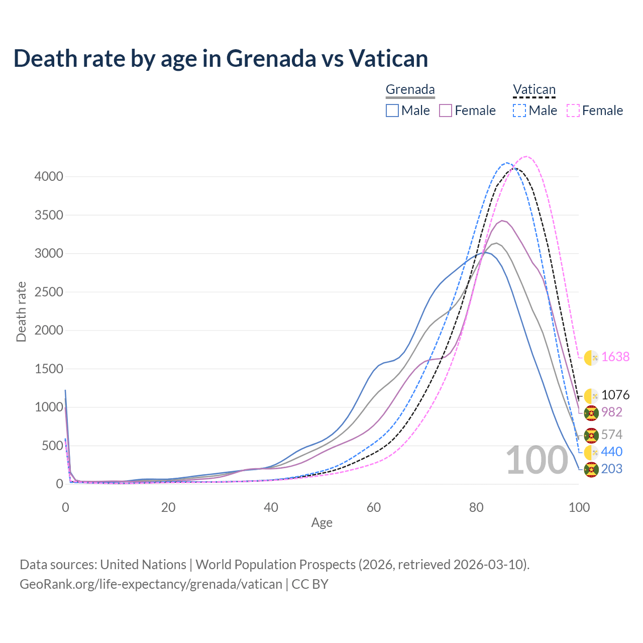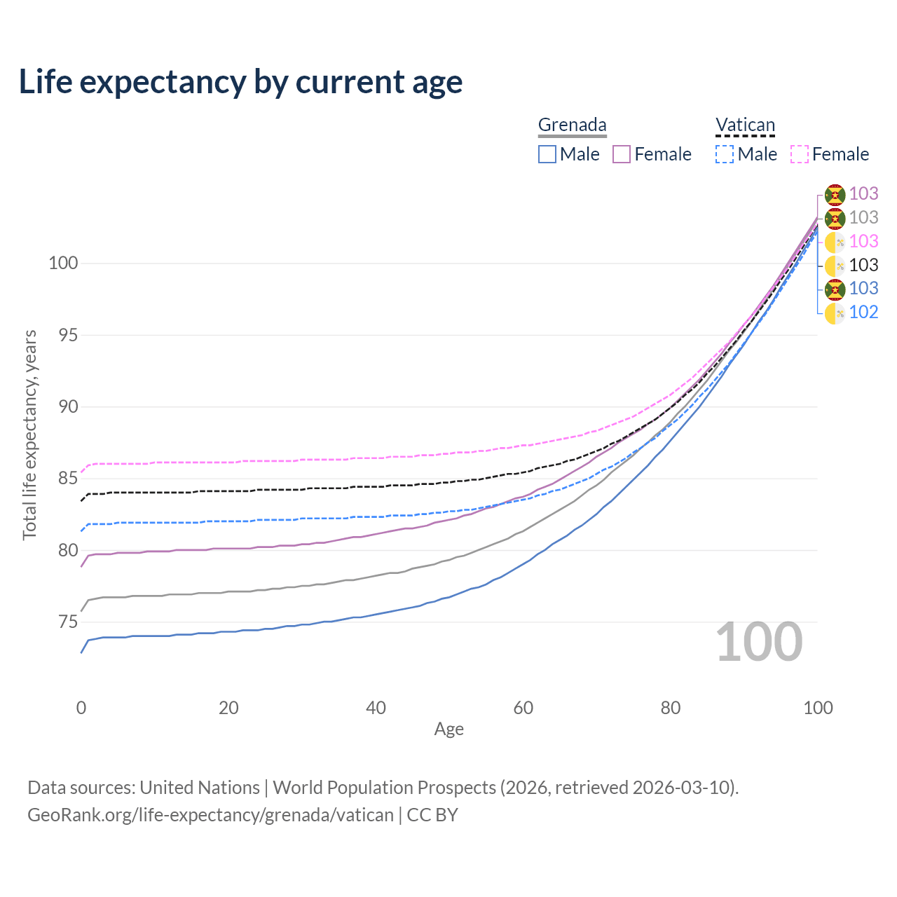 This life expectancy calculator shows the odds of living to 100, 95, 90, and below based on current age for both males and females in Grenada and the Vatican, along with mean and median age of death. The calculations are based on the 2026 life tables (actuarial tables) from the UN World Population Prospects.
