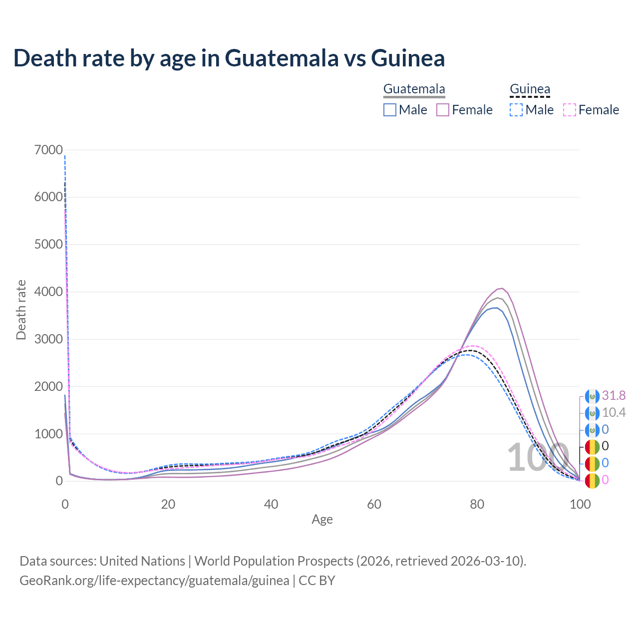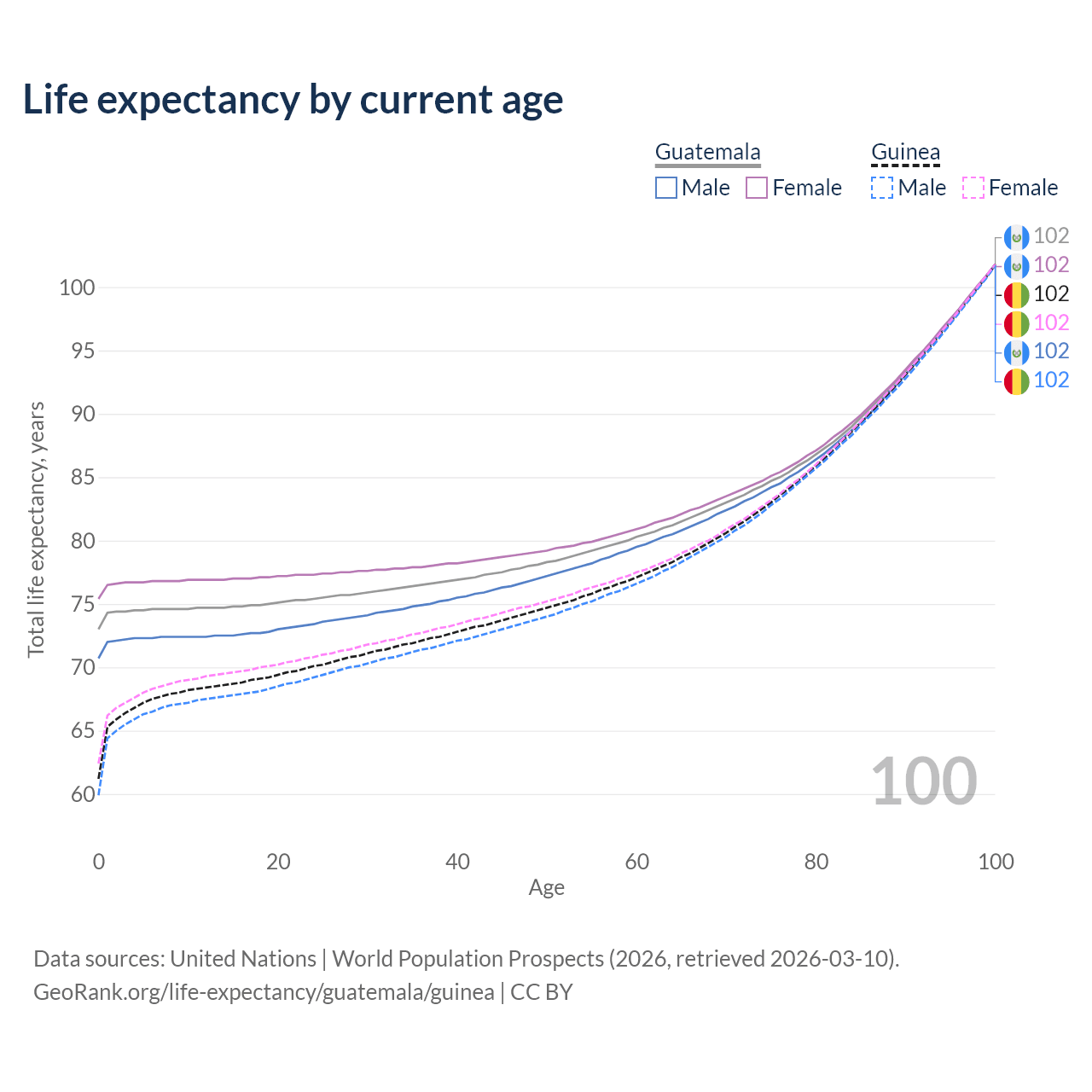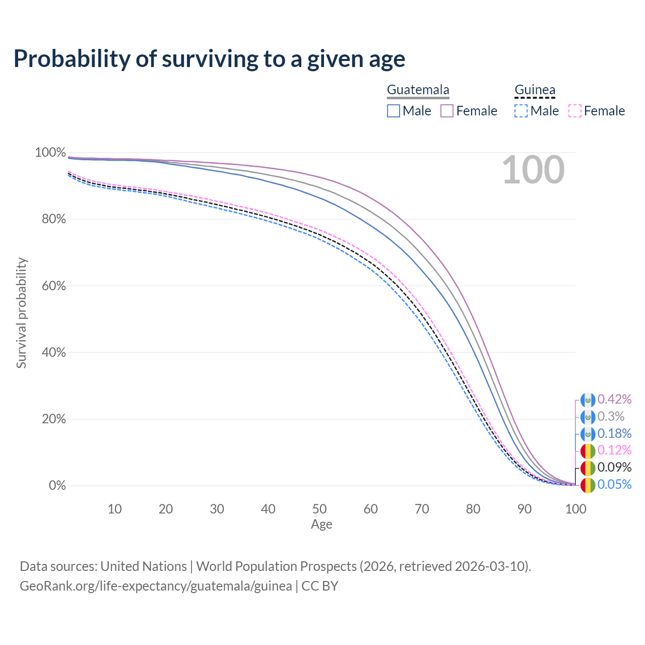 This life expectancy calculator shows the odds of living to 100, 95, 90, and below based on current age for both males and females in Guatemala and Guinea, along with mean and median age of death. The calculations are based on the 2026 life tables (actuarial tables) from the UN World Population Prospects.
