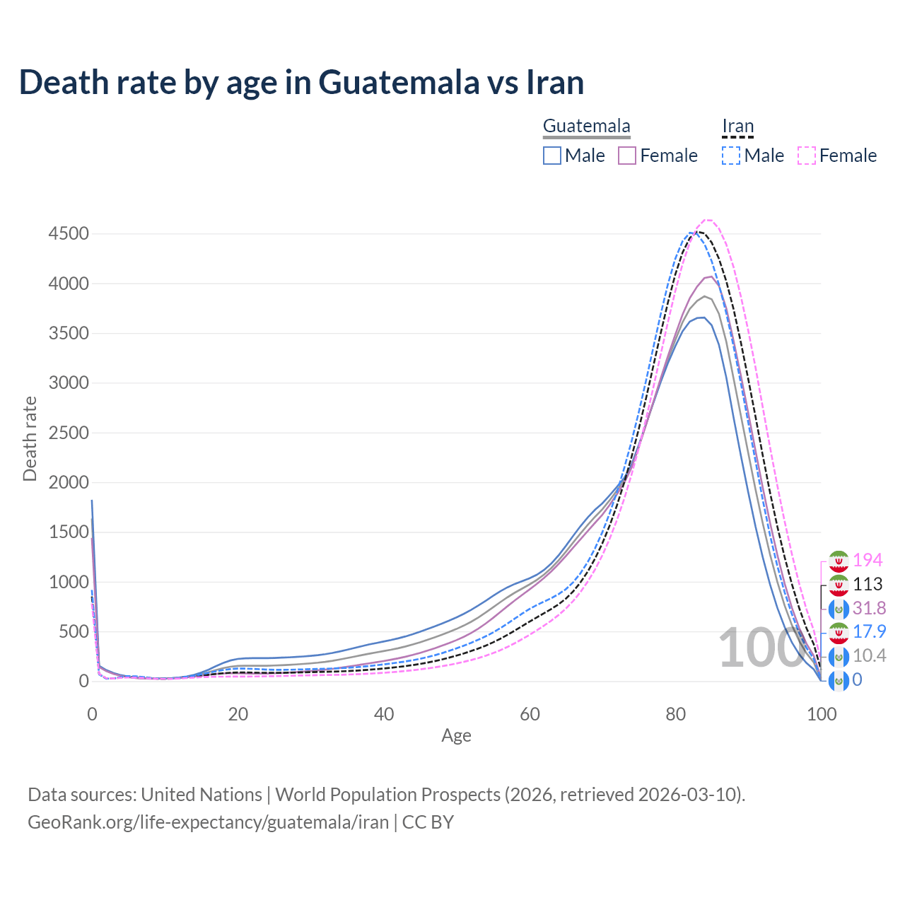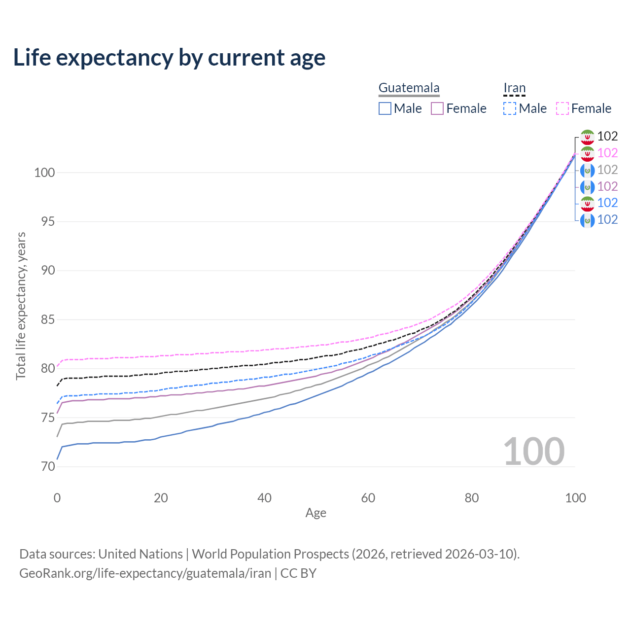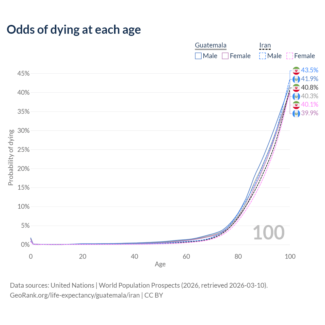 This life expectancy calculator shows the odds of living to 100, 95, 90, and below based on current age for both males and females in Guatemala and Iran, along with mean and median age of death. The calculations are based on the 2026 life tables (actuarial tables) from the UN World Population Prospects.