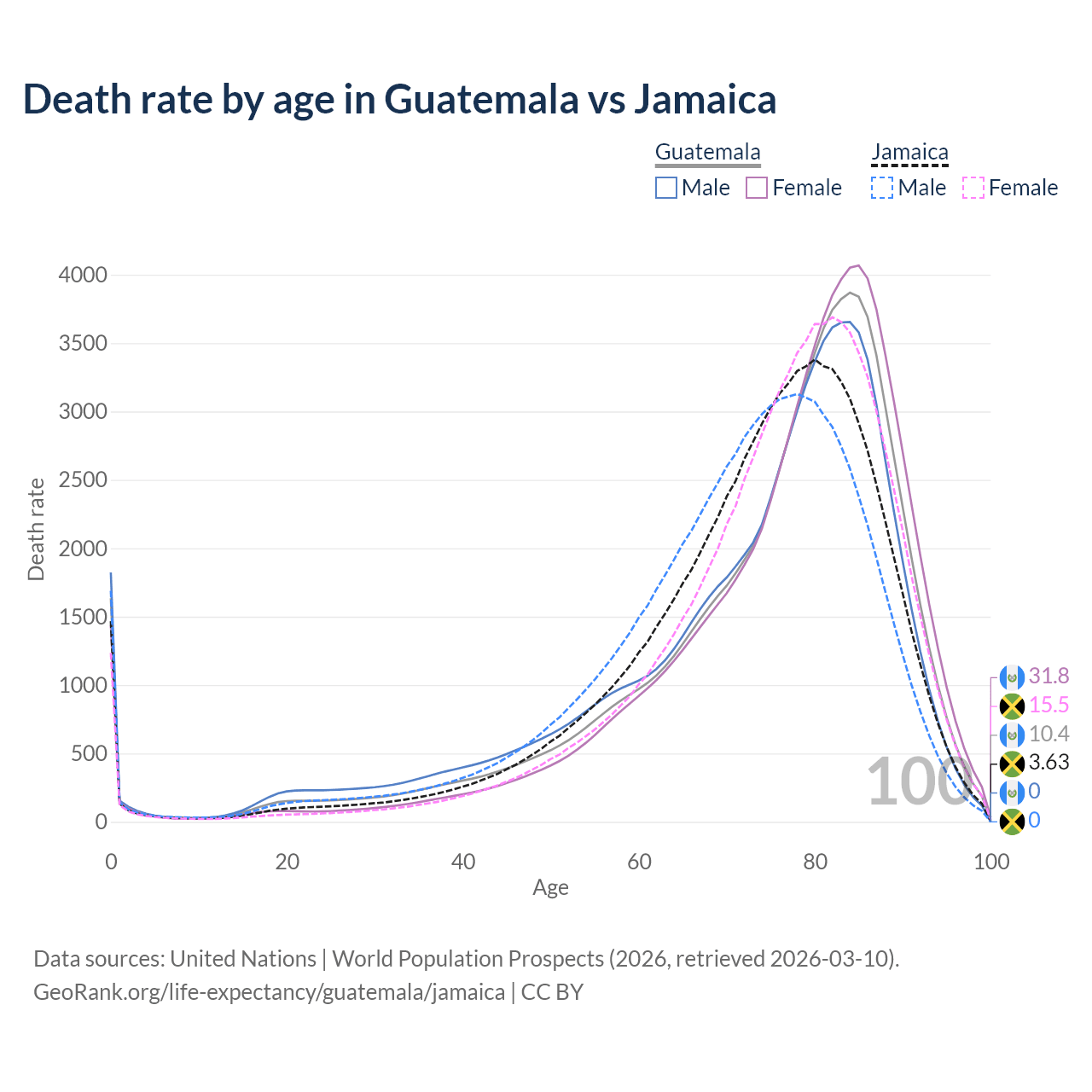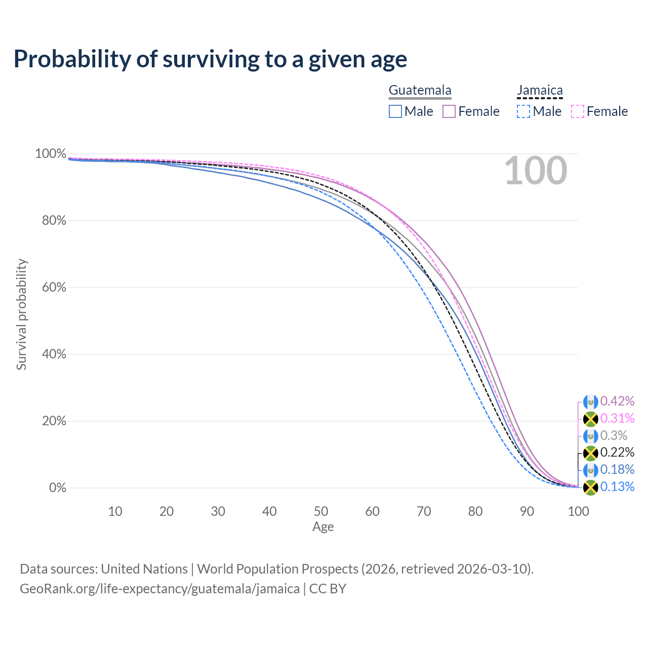 This life expectancy calculator shows the odds of living to 100, 95, 90, and below based on current age for both males and females in Guatemala and Jamaica, along with mean and median age of death. The calculations are based on the 2026 life tables (actuarial tables) from the UN World Population Prospects.