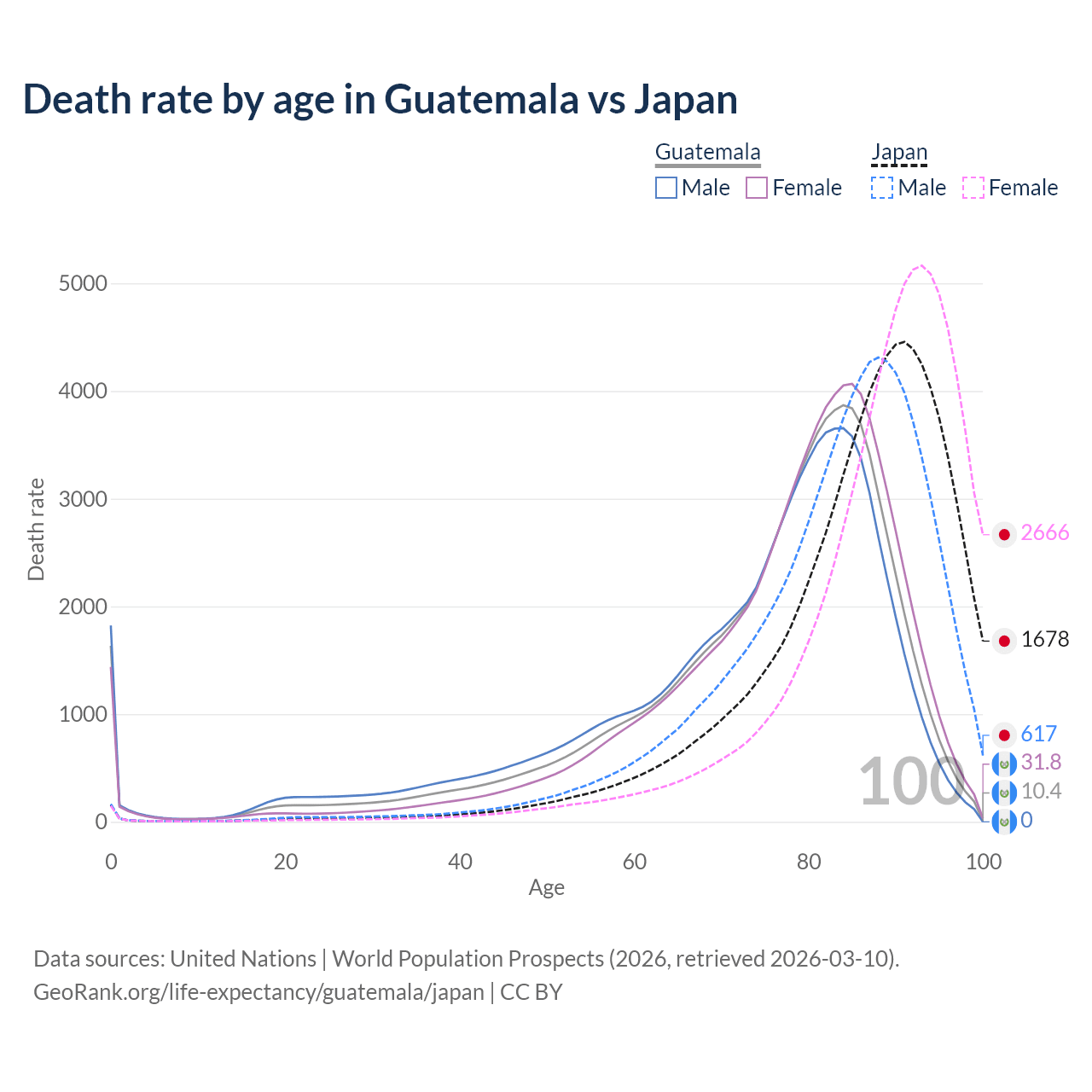 In Guatemala, the most common age of death is 84, compared to 91 in Japan. The median age of death is 78.7 in Guatemala and 88.1 in Japan, meaning only half of each cohort is expected to live past that age.