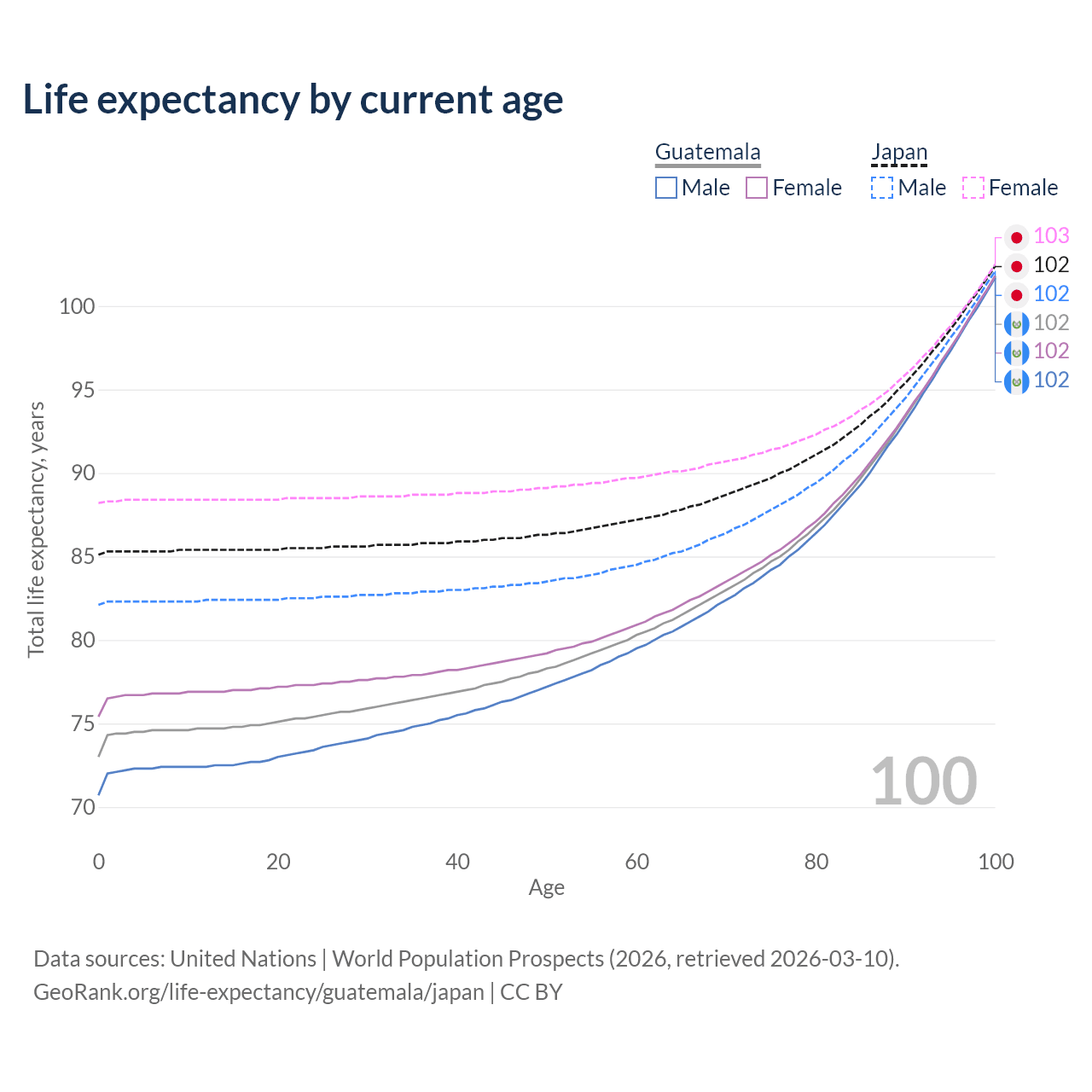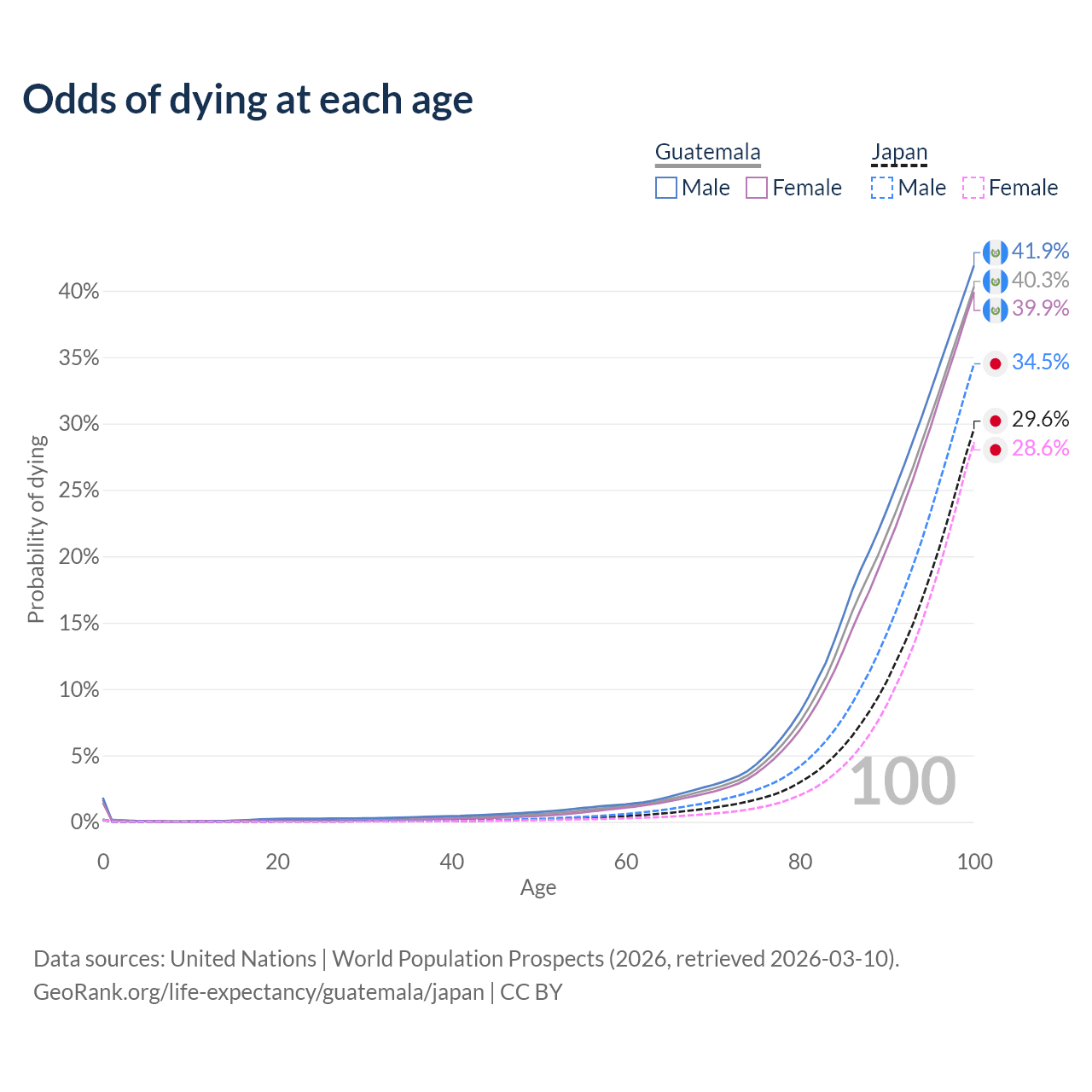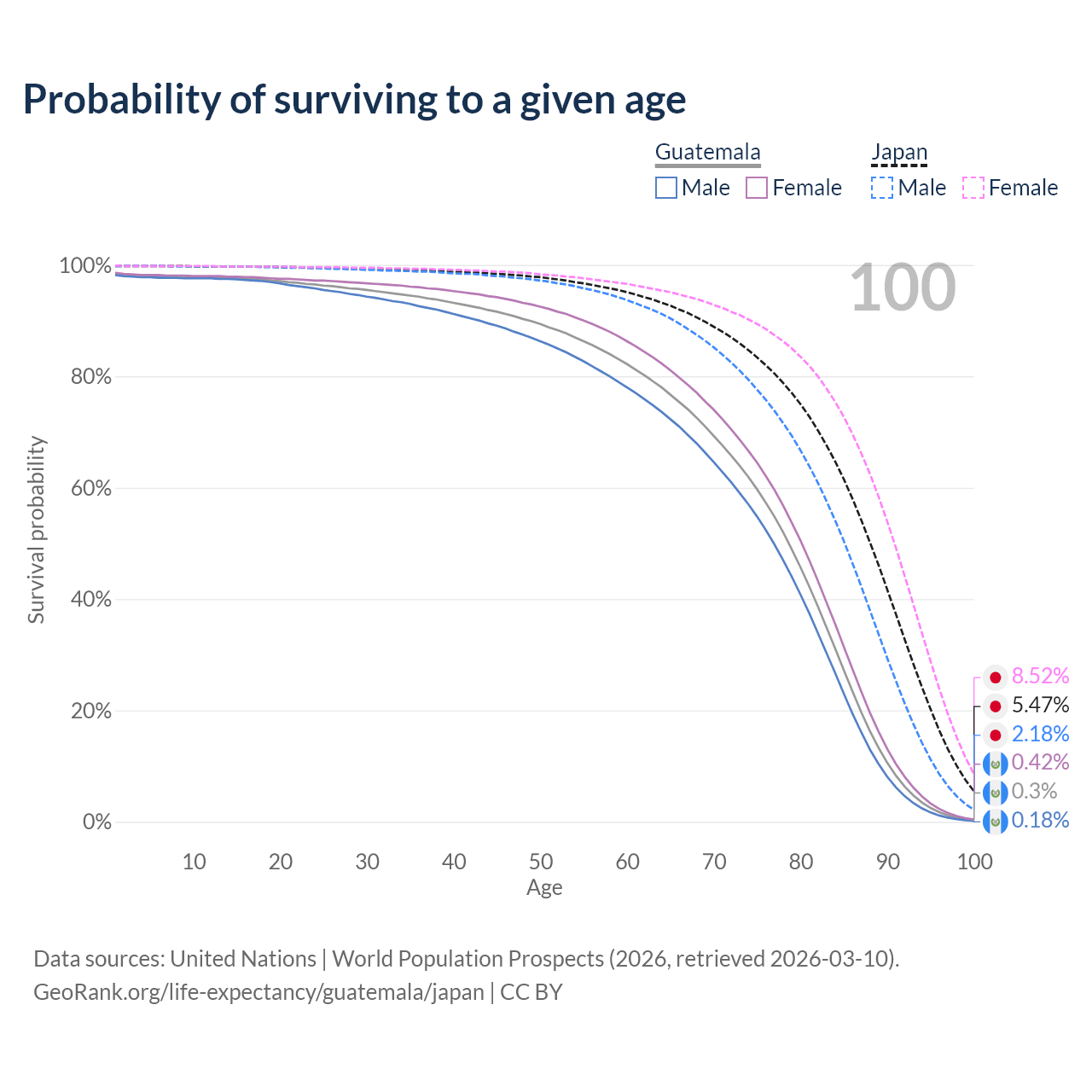 This life expectancy calculator shows the odds of living to 100, 95, 90, and below based on current age for both males and females in Guatemala and Japan, along with mean and median age of death. The calculations are based on the 2026 life tables (actuarial tables) from the UN World Population Prospects.