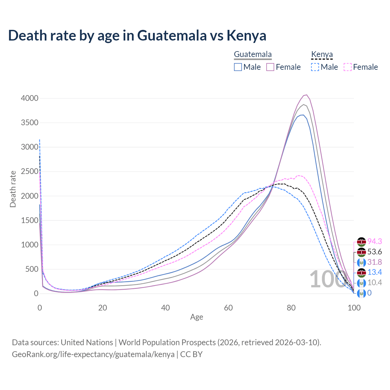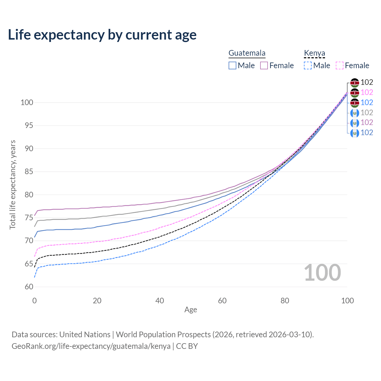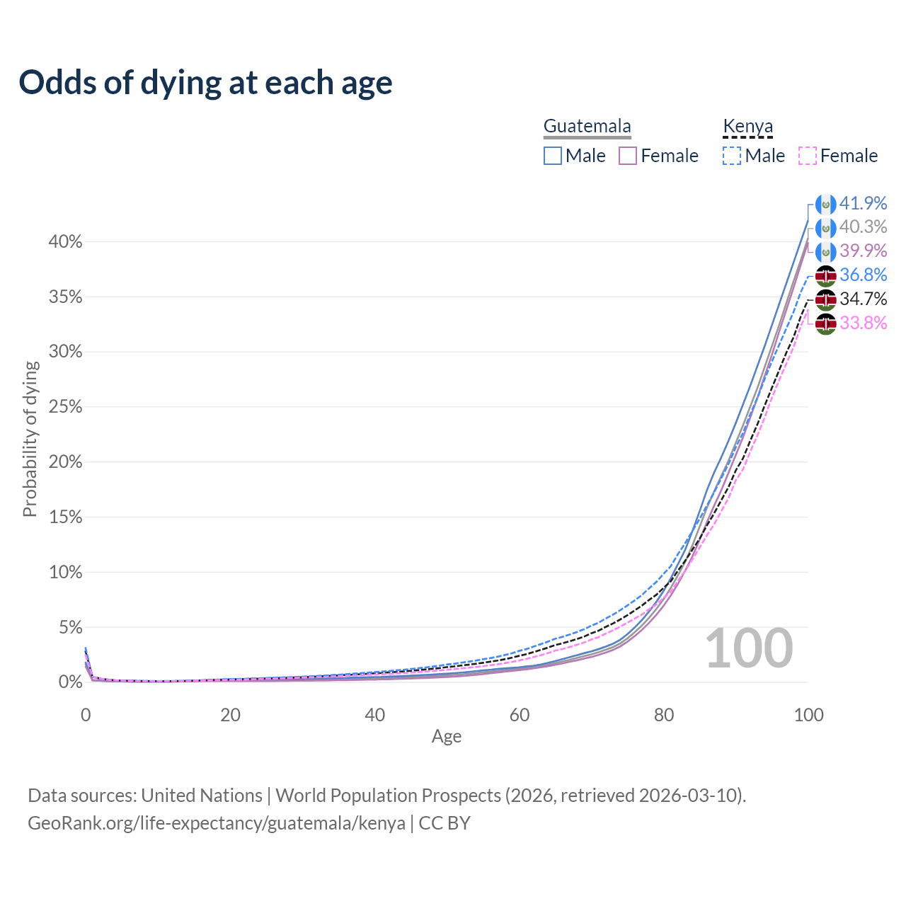 This life expectancy calculator shows the odds of living to 100, 95, 90, and below based on current age for both males and females in Guatemala and Kenya, along with mean and median age of death. The calculations are based on the 2026 life tables (actuarial tables) from the UN World Population Prospects.