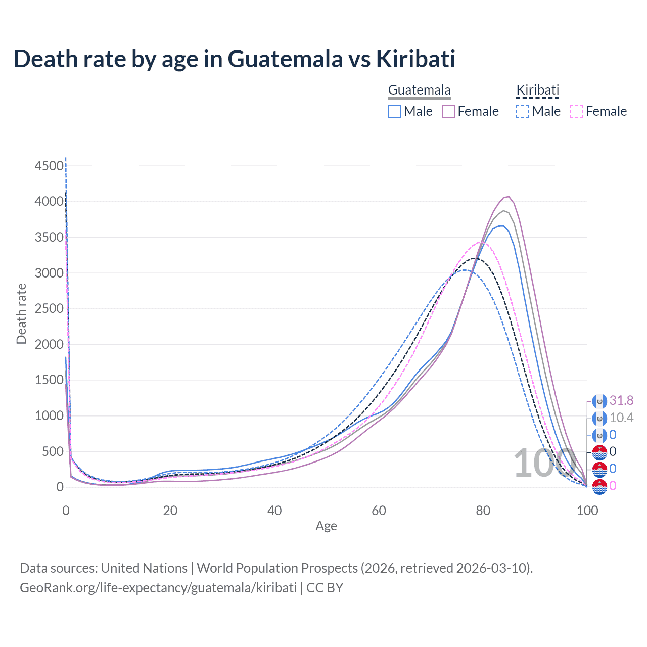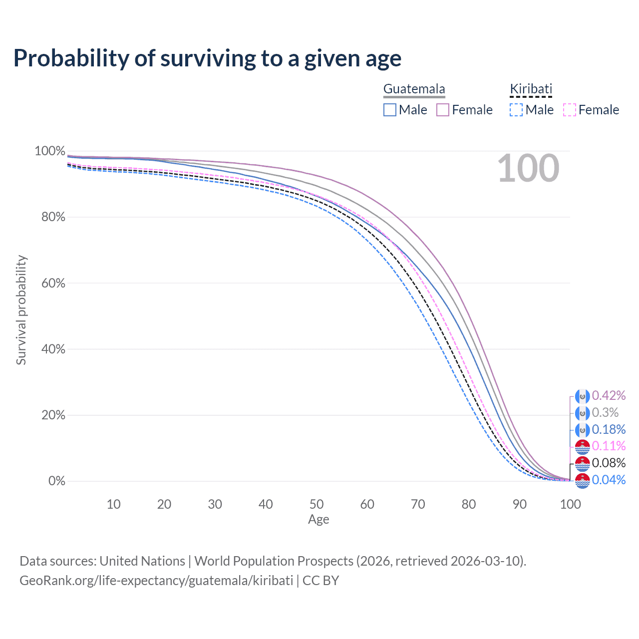 This life expectancy calculator shows the odds of living to 100, 95, 90, and below based on current age for both males and females in Guatemala and Kiribati, along with mean and median age of death. The calculations are based on the 2026 life tables (actuarial tables) from the UN World Population Prospects.
