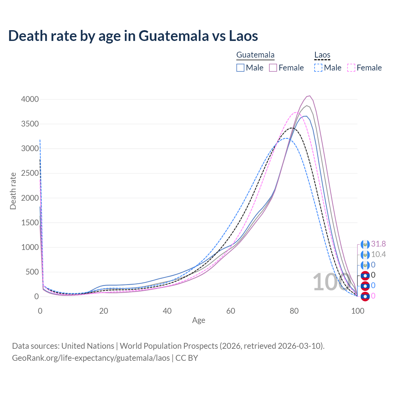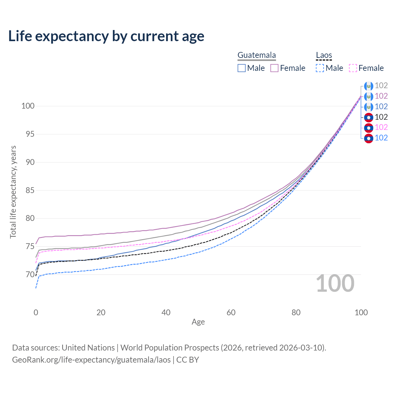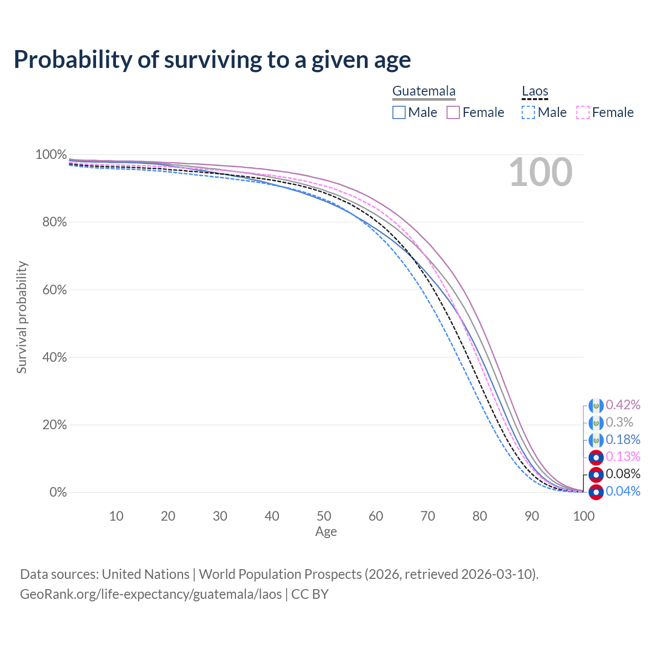 This life expectancy calculator shows the odds of living to 100, 95, 90, and below based on current age for both males and females in Guatemala and Laos, along with mean and median age of death. The calculations are based on the 2026 life tables (actuarial tables) from the UN World Population Prospects.