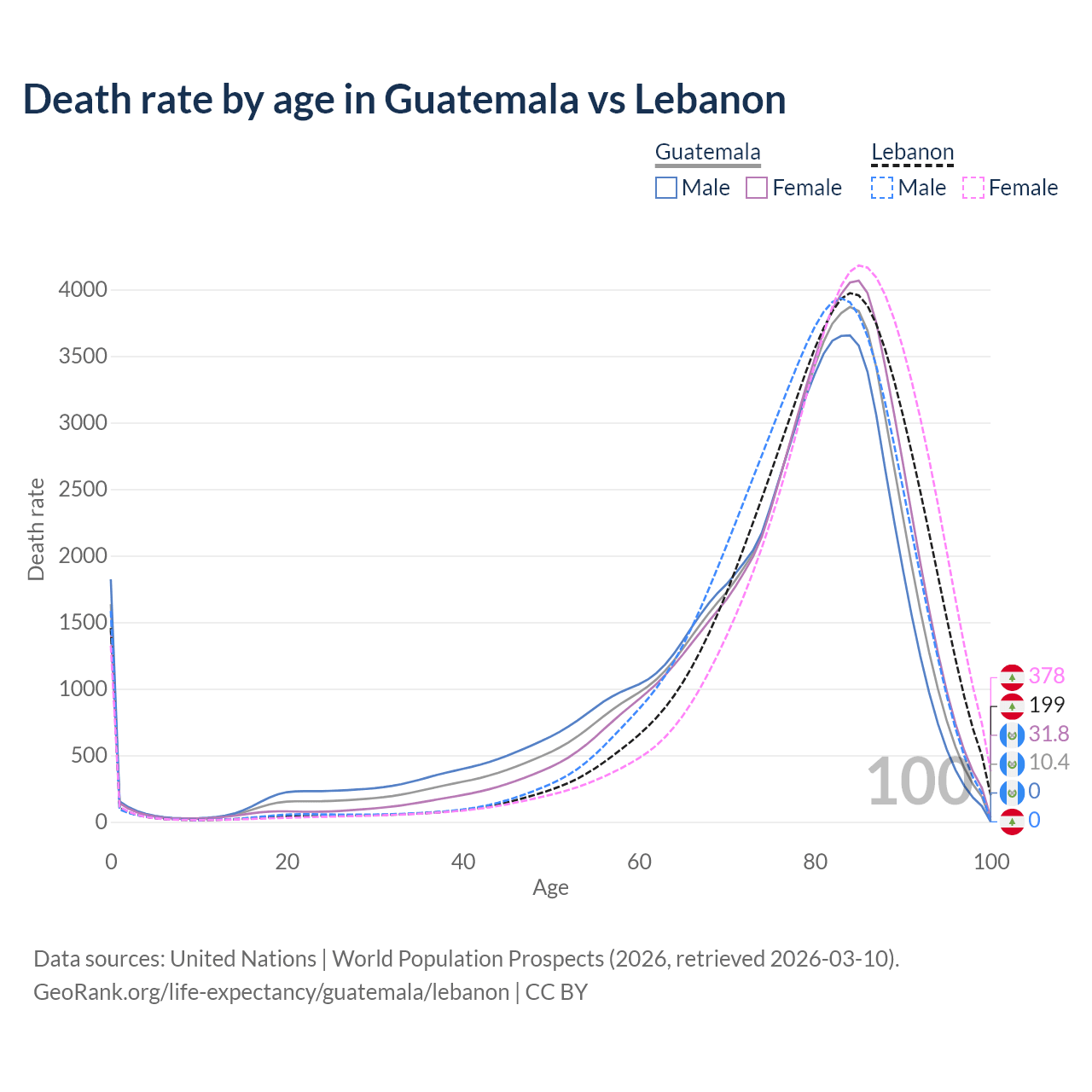 In Guatemala, the most common age of death is 84, compared to 84 in Lebanon. The median age of death is 78.7 in Guatemala and 81.6 in Lebanon, meaning only half of each cohort is expected to live past that age.