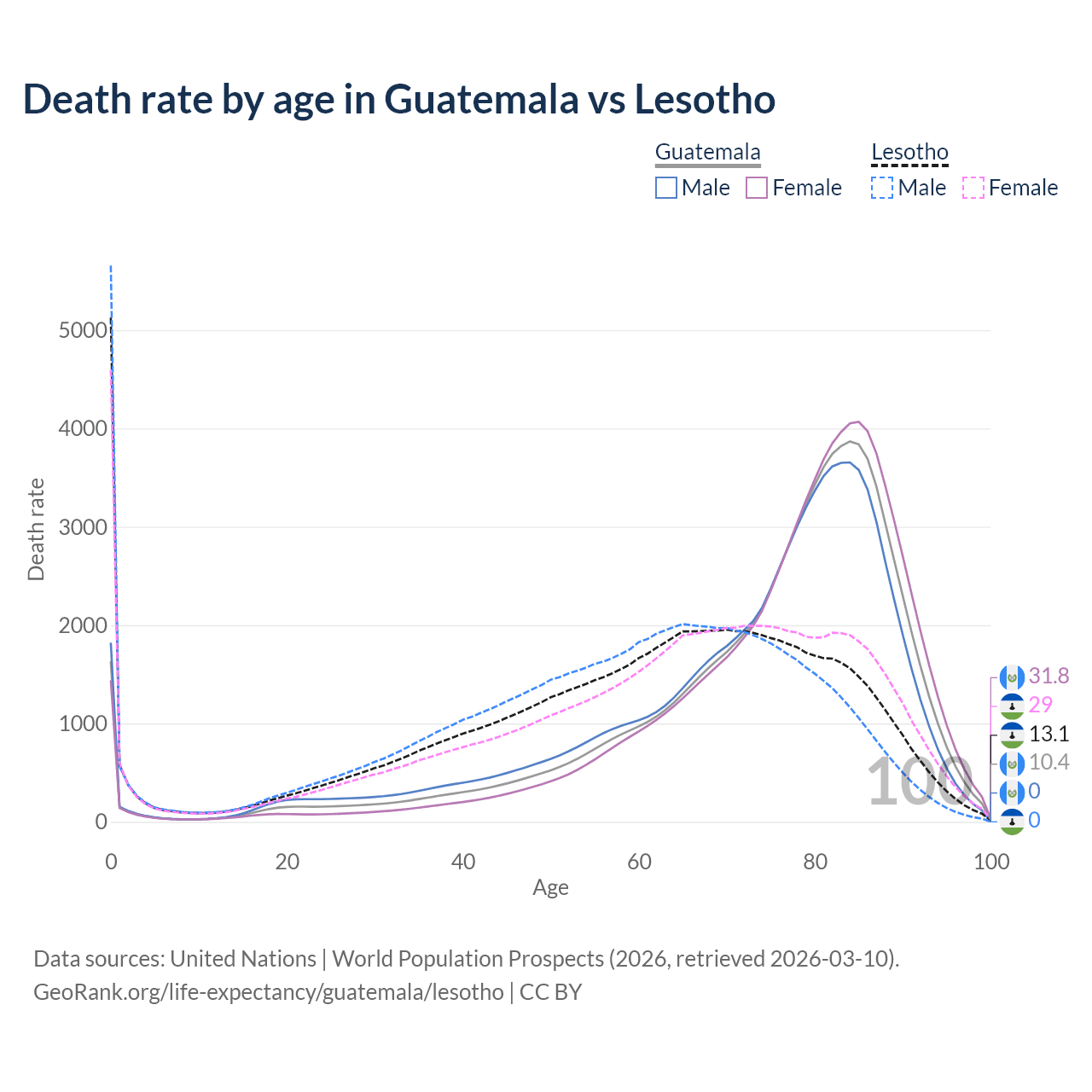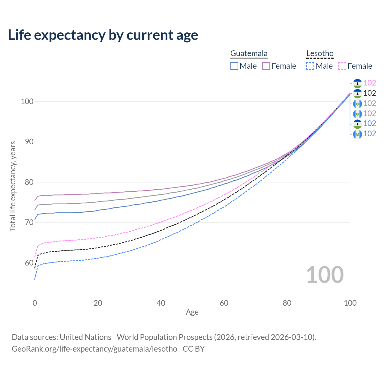 This life expectancy calculator shows the odds of living to 100, 95, 90, and below based on current age for both males and females in Guatemala and Lesotho, along with mean and median age of death. The calculations are based on the 2026 life tables (actuarial tables) from the UN World Population Prospects.