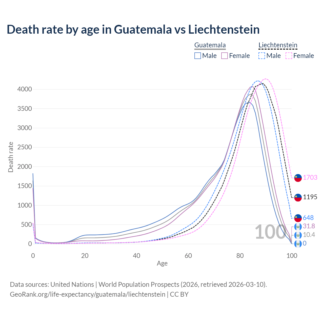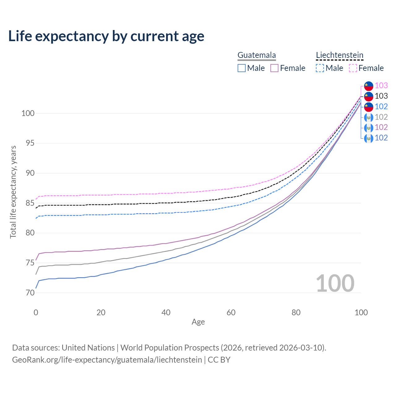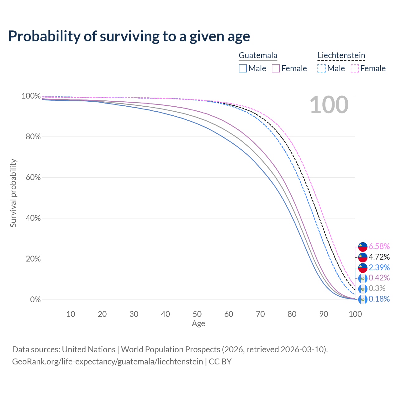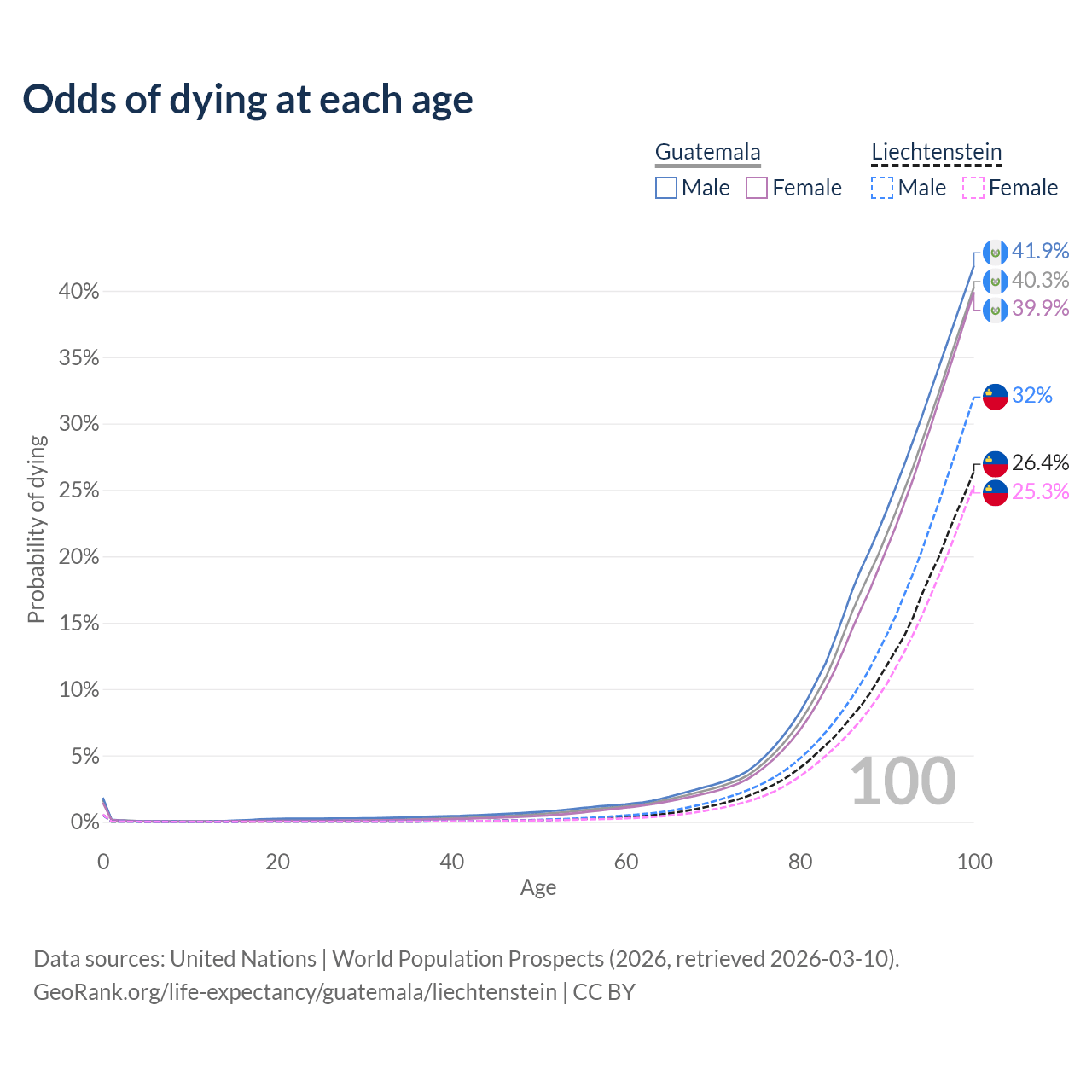 This life expectancy calculator shows the odds of living to 100, 95, 90, and below based on current age for both males and females in Guatemala and Liechtenstein, along with mean and median age of death. The calculations are based on the 2026 life tables (actuarial tables) from the UN World Population Prospects.