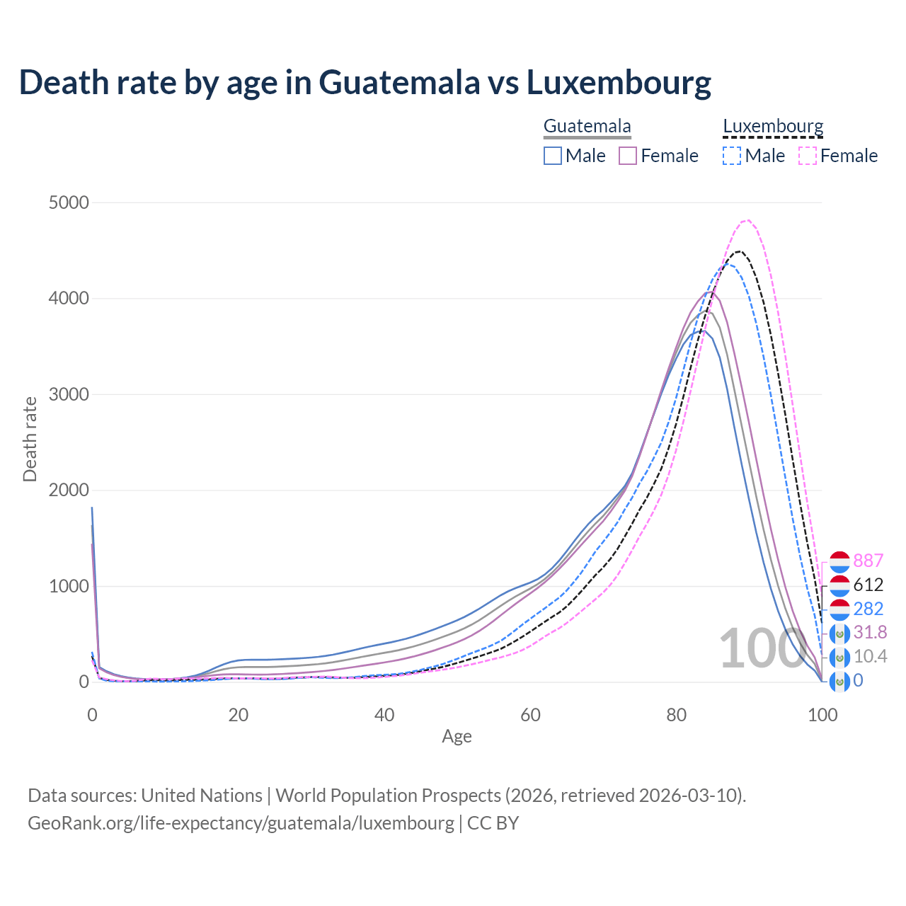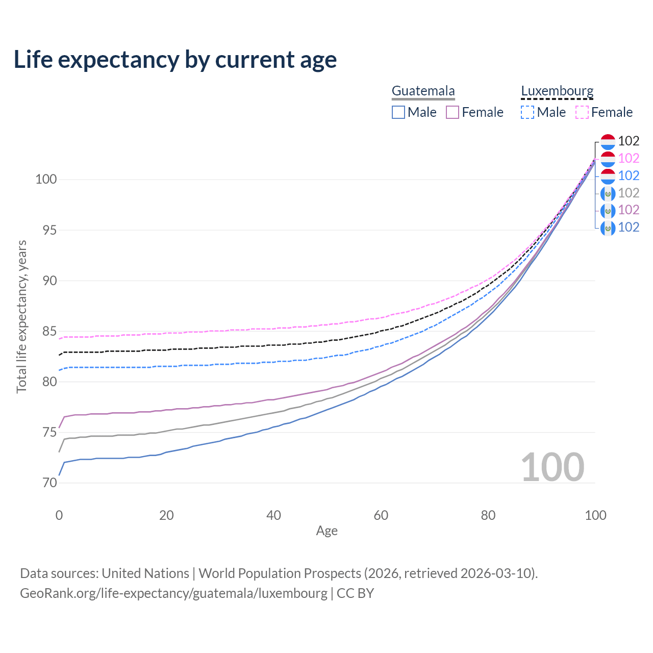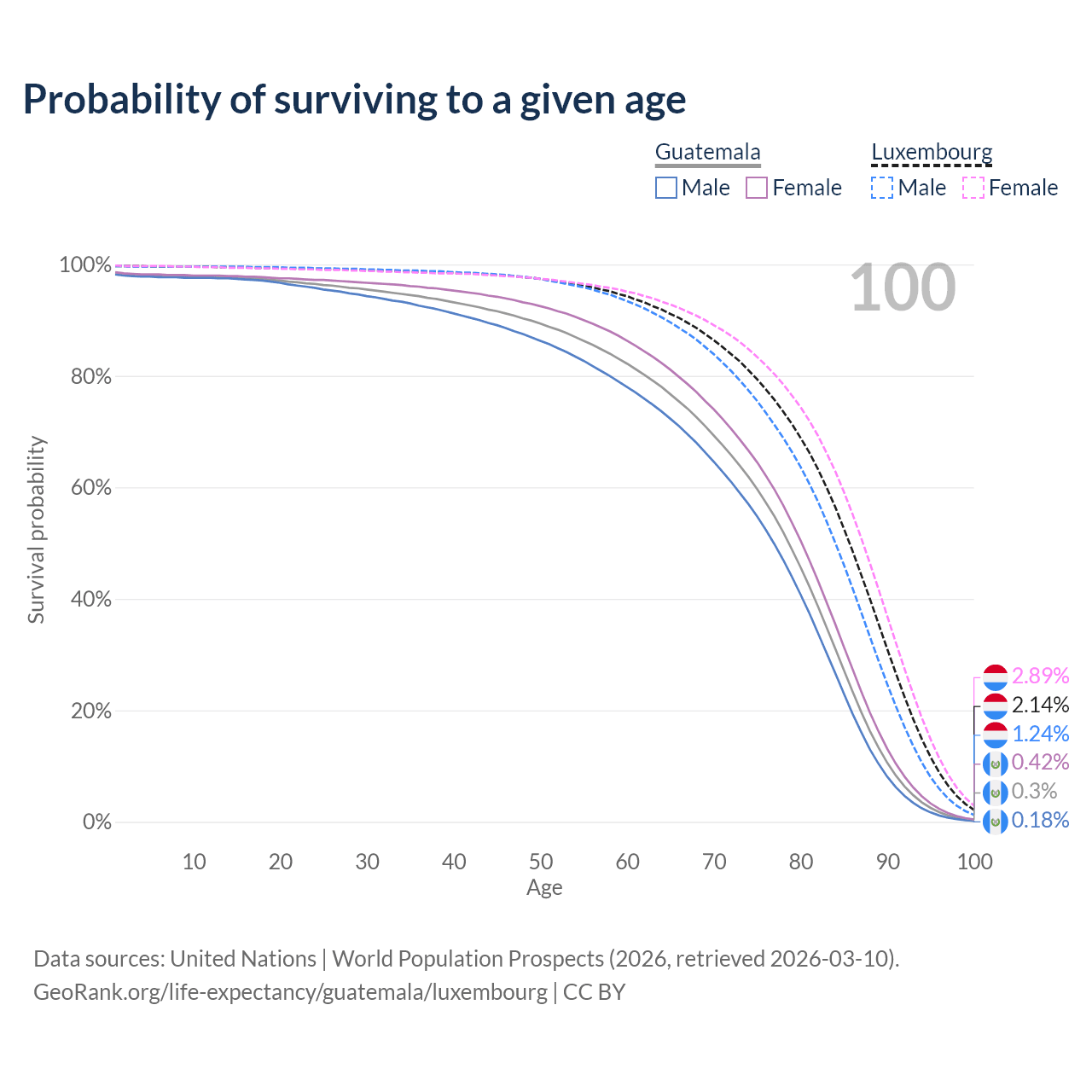 This life expectancy calculator shows the odds of living to 100, 95, 90, and below based on current age for both males and females in Guatemala and Luxembourg, along with mean and median age of death. The calculations are based on the 2026 life tables (actuarial tables) from the UN World Population Prospects.