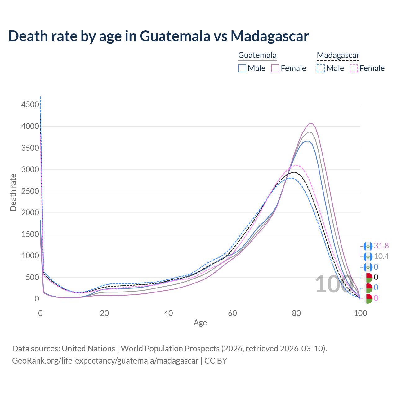 This life expectancy calculator shows the odds of living to 100, 95, 90, and below based on current age for both males and females in Guatemala and Madagascar, along with mean and median age of death. The calculations are based on the 2026 life tables (actuarial tables) from the UN World Population Prospects.
