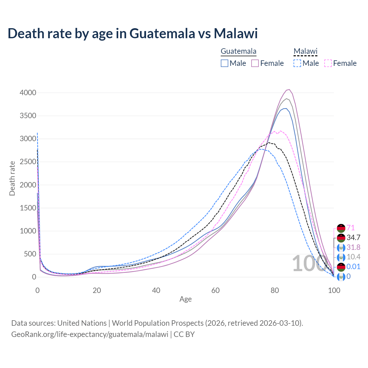 This life expectancy calculator shows the odds of living to 100, 95, 90, and below based on current age for both males and females in Guatemala and Malawi, along with mean and median age of death. The calculations are based on the 2026 life tables (actuarial tables) from the UN World Population Prospects.
