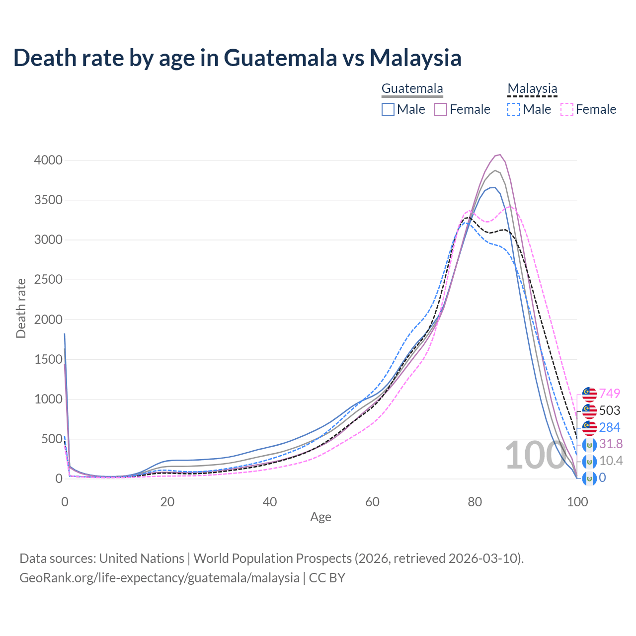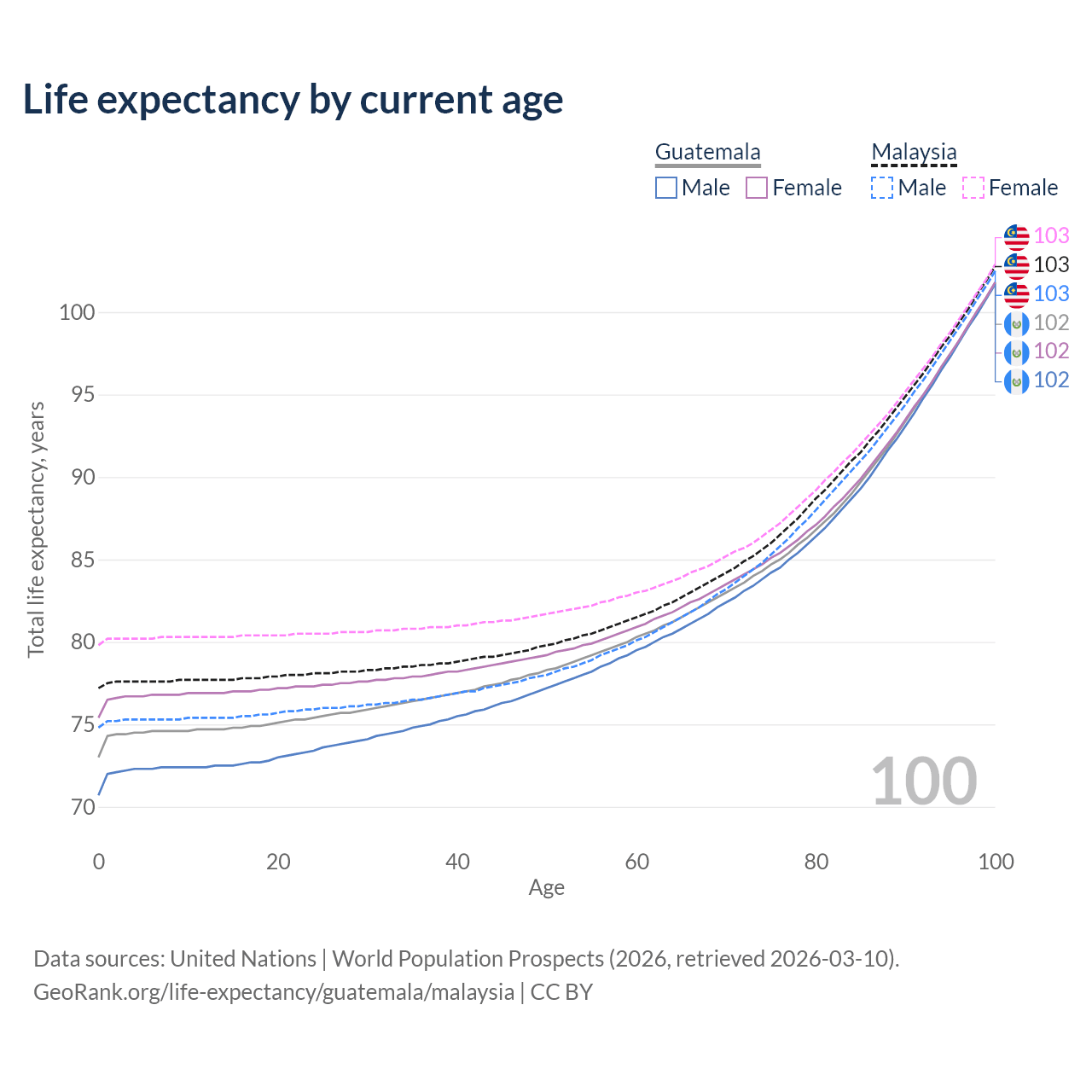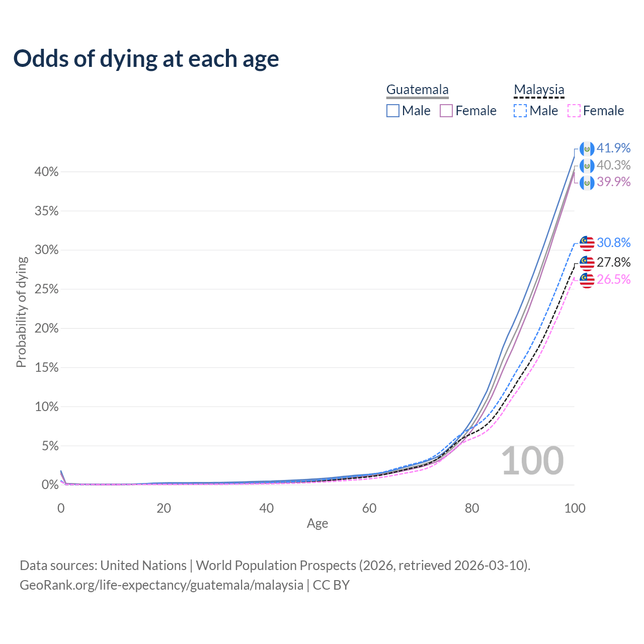 This life expectancy calculator shows the odds of living to 100, 95, 90, and below based on current age for both males and females in Guatemala and Malaysia, along with mean and median age of death. The calculations are based on the 2026 life tables (actuarial tables) from the UN World Population Prospects.