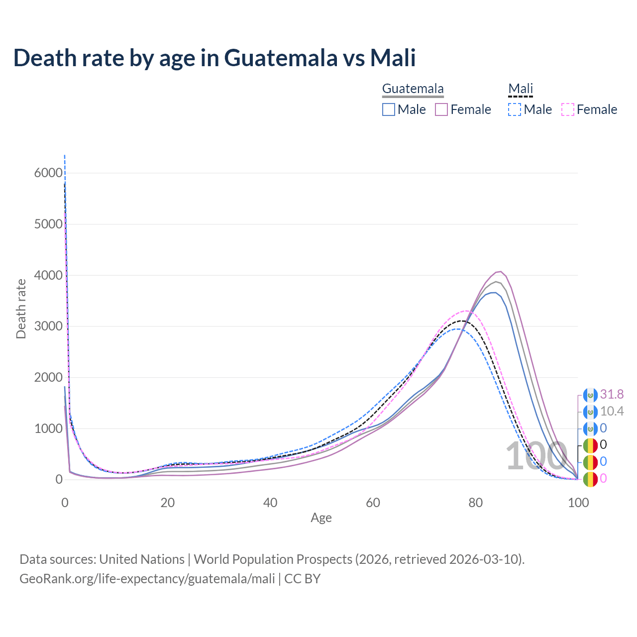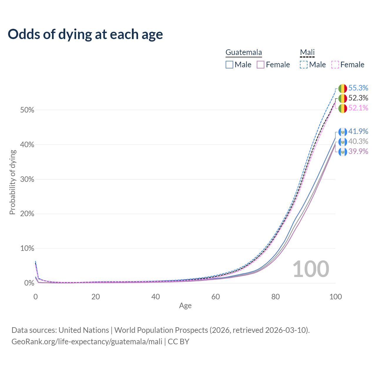 This life expectancy calculator shows the odds of living to 100, 95, 90, and below based on current age for both males and females in Guatemala and Mali, along with mean and median age of death. The calculations are based on the 2026 life tables (actuarial tables) from the UN World Population Prospects.