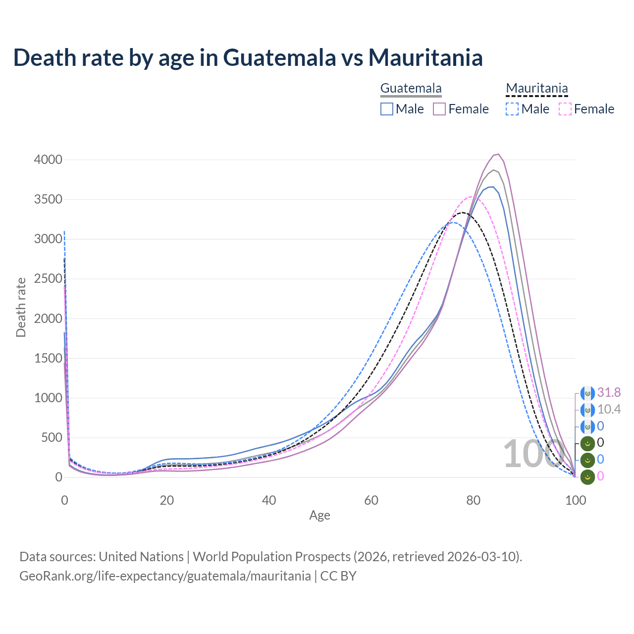 In Guatemala, the most common age of death is 84, compared to 78 in Mauritania. The median age of death is 78.7 in Guatemala and 74.1 in Mauritania, meaning only half of each cohort is expected to live past that age.