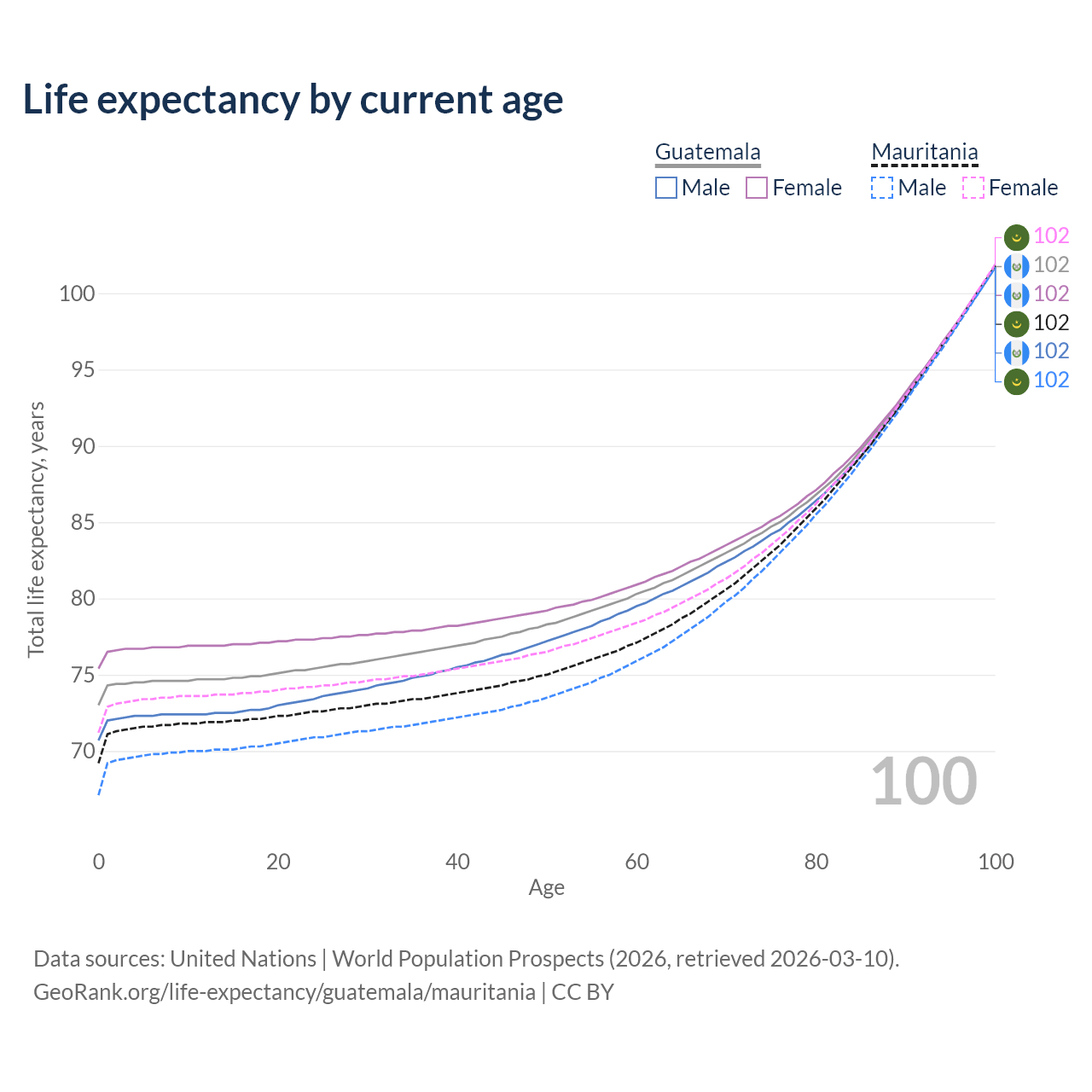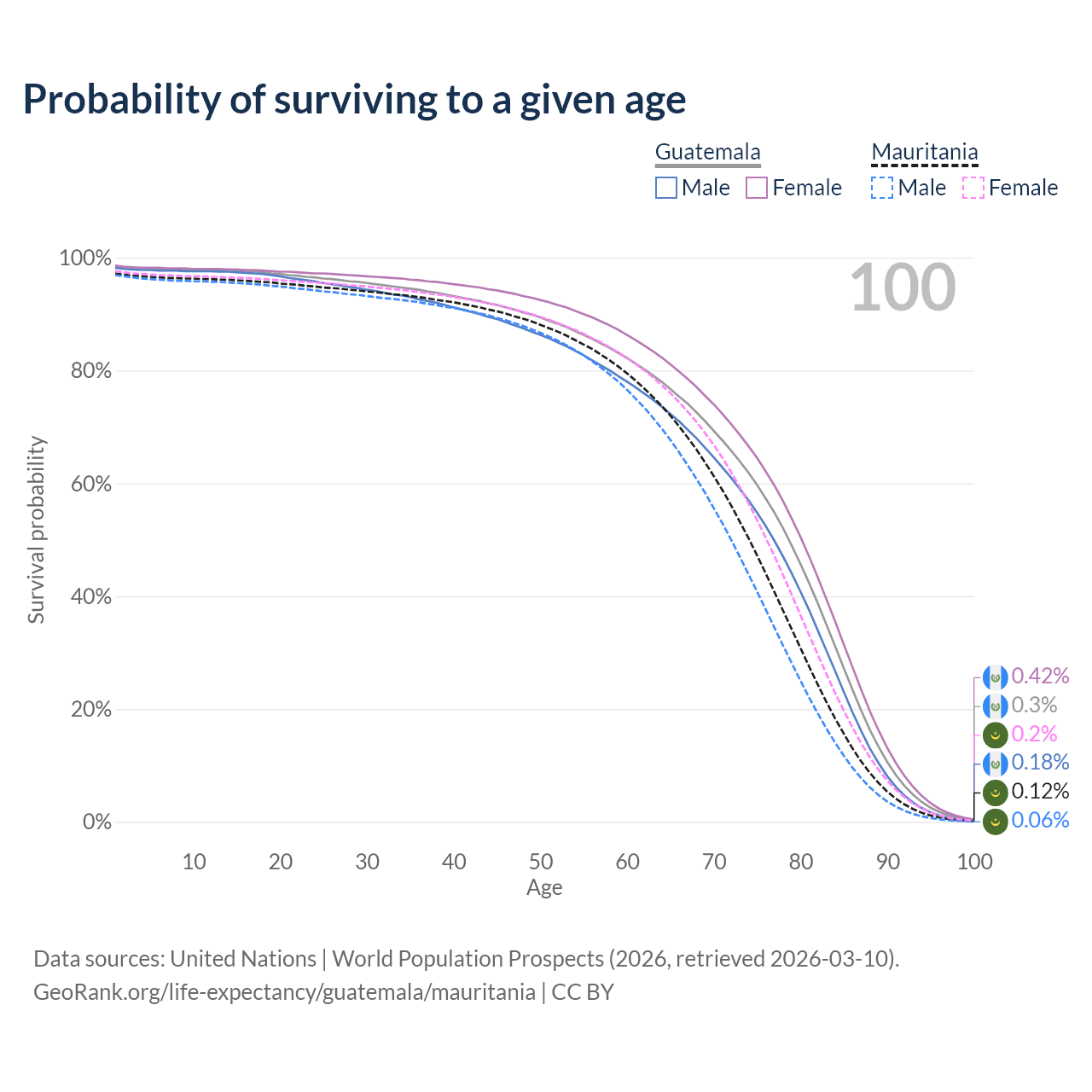 This life expectancy calculator shows the odds of living to 100, 95, 90, and below based on current age for both males and females in Guatemala and Mauritania, along with mean and median age of death. The calculations are based on the 2026 life tables (actuarial tables) from the UN World Population Prospects.