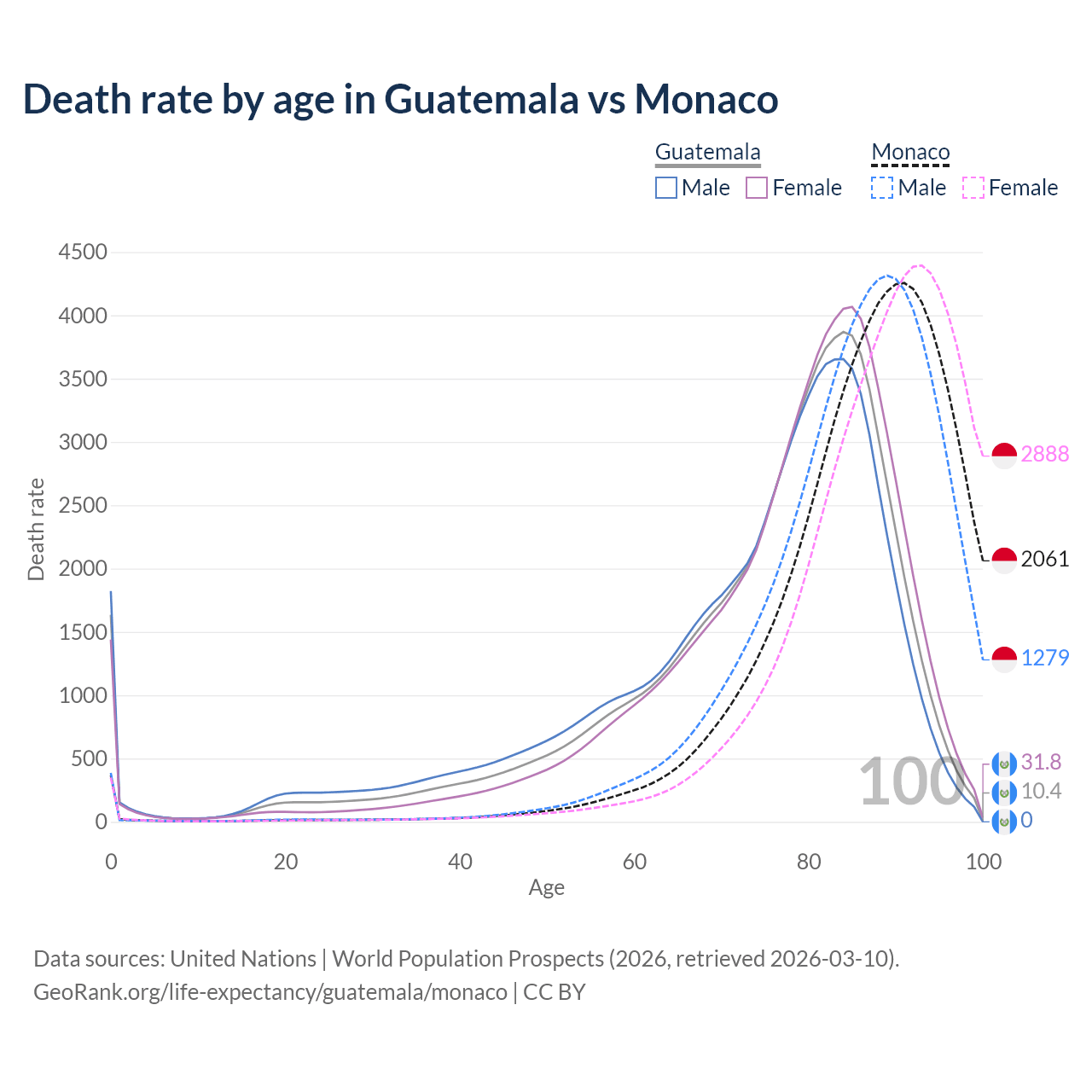 In Guatemala, the most common age of death is 84, compared to 91 in Monaco. The median age of death is 78.7 in Guatemala and 88.7 in Monaco, meaning only half of each cohort is expected to live past that age.