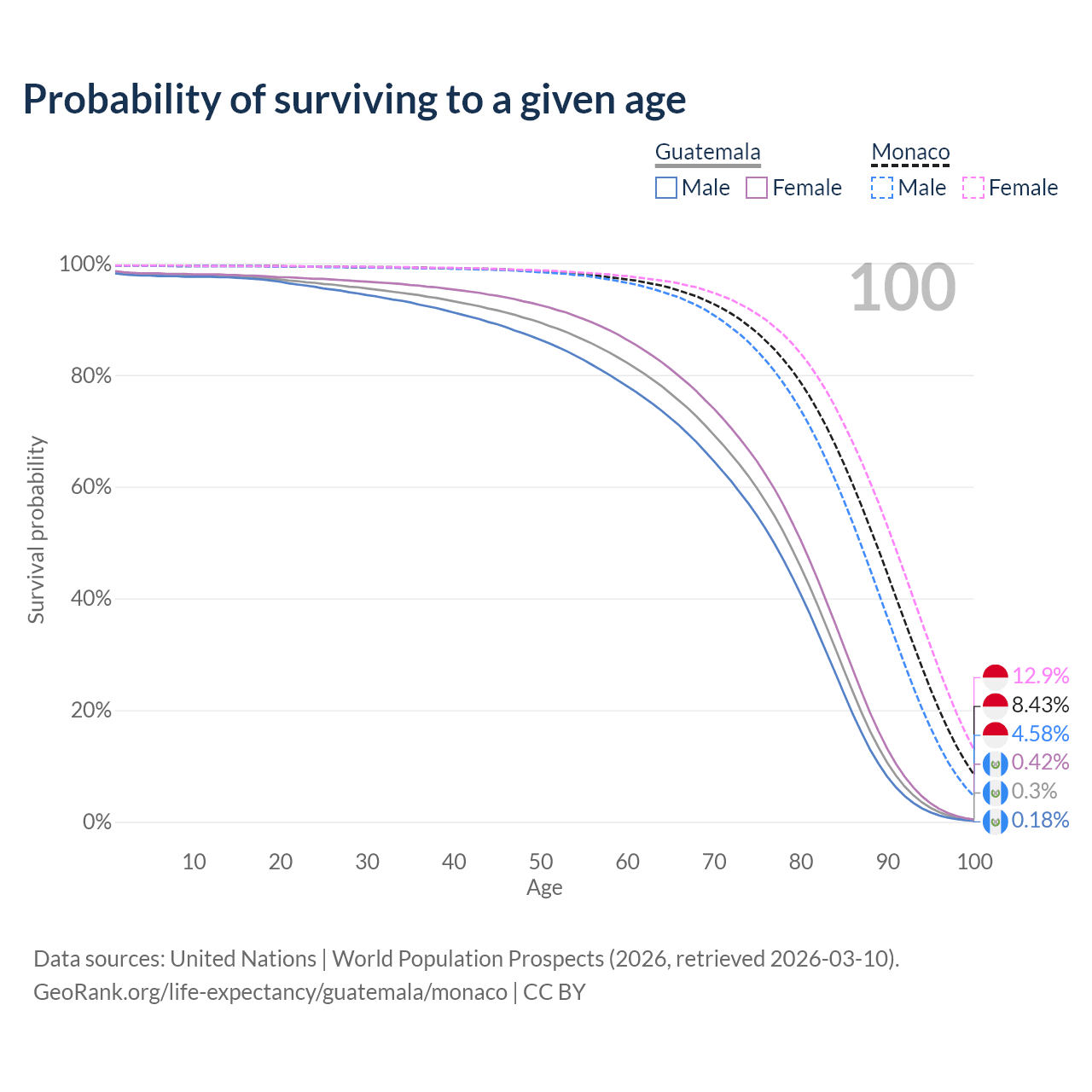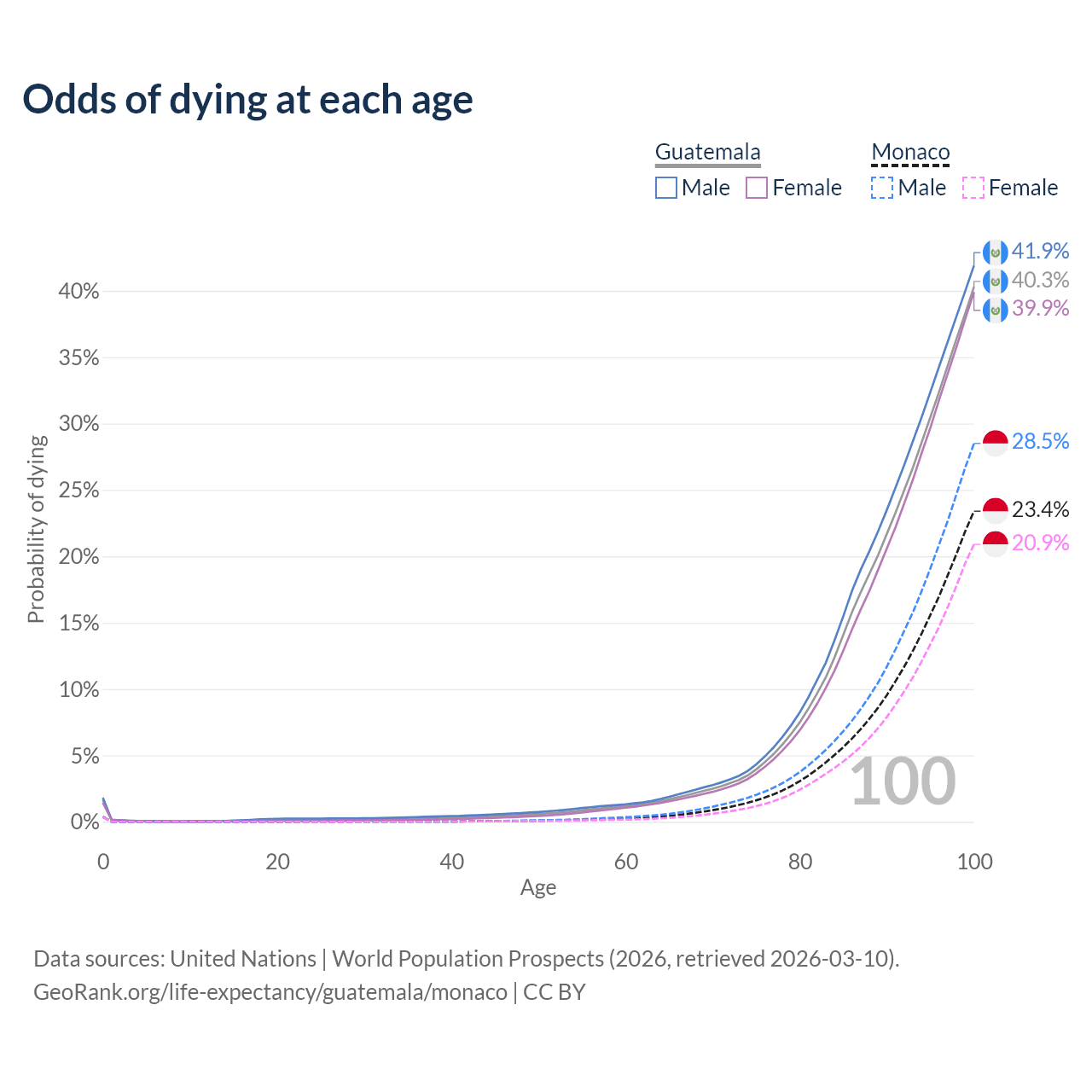 This life expectancy calculator shows the odds of living to 100, 95, 90, and below based on current age for both males and females in Guatemala and Monaco, along with mean and median age of death. The calculations are based on the 2026 life tables (actuarial tables) from the UN World Population Prospects.
