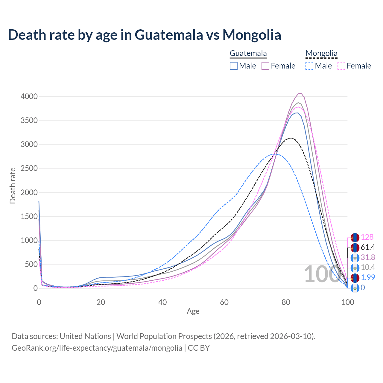 In Guatemala, the most common age of death is 84, compared to 82 in Mongolia. The median age of death is 78.7 in Guatemala and 76 in Mongolia, meaning only half of each cohort is expected to live past that age.