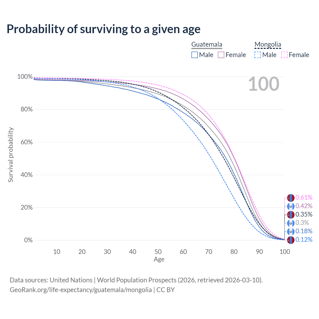 This life expectancy calculator shows the odds of living to 100, 95, 90, and below based on current age for both males and females in Guatemala and Mongolia, along with mean and median age of death. The calculations are based on the 2026 life tables (actuarial tables) from the UN World Population Prospects.