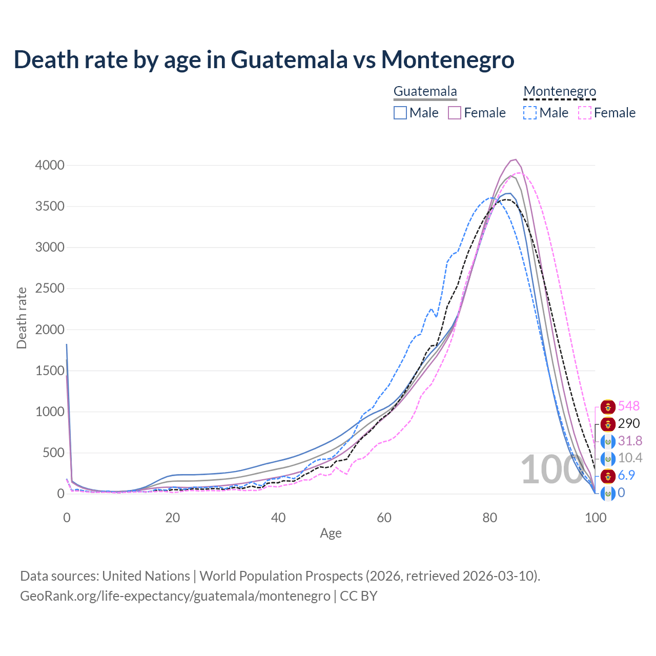 This life expectancy calculator shows the odds of living to 100, 95, 90, and below based on current age for both males and females in Guatemala and Montenegro, along with mean and median age of death. The calculations are based on the 2026 life tables (actuarial tables) from the UN World Population Prospects.