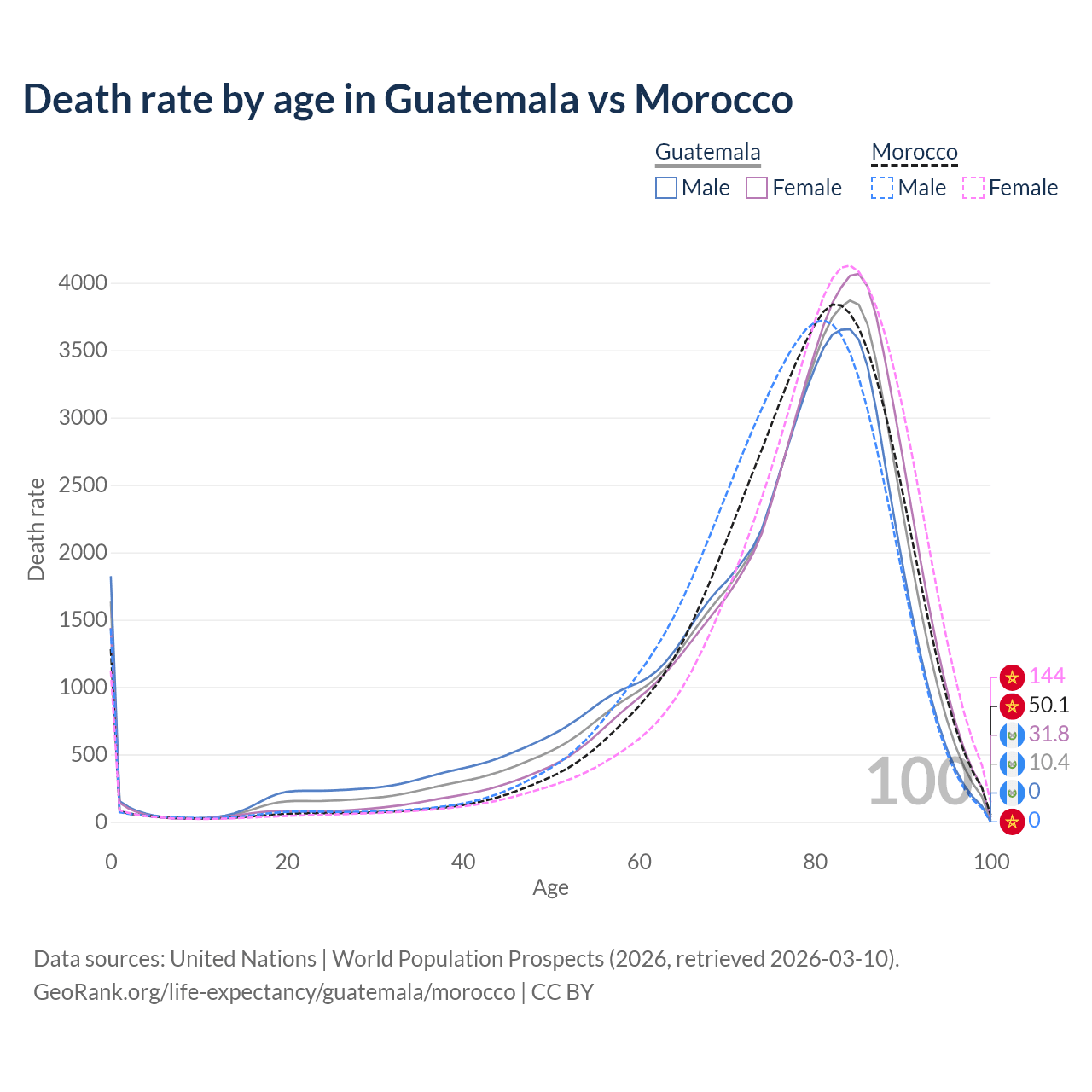 This life expectancy calculator shows the odds of living to 100, 95, 90, and below based on current age for both males and females in Guatemala and Morocco, along with mean and median age of death. The calculations are based on the 2026 life tables (actuarial tables) from the UN World Population Prospects.
