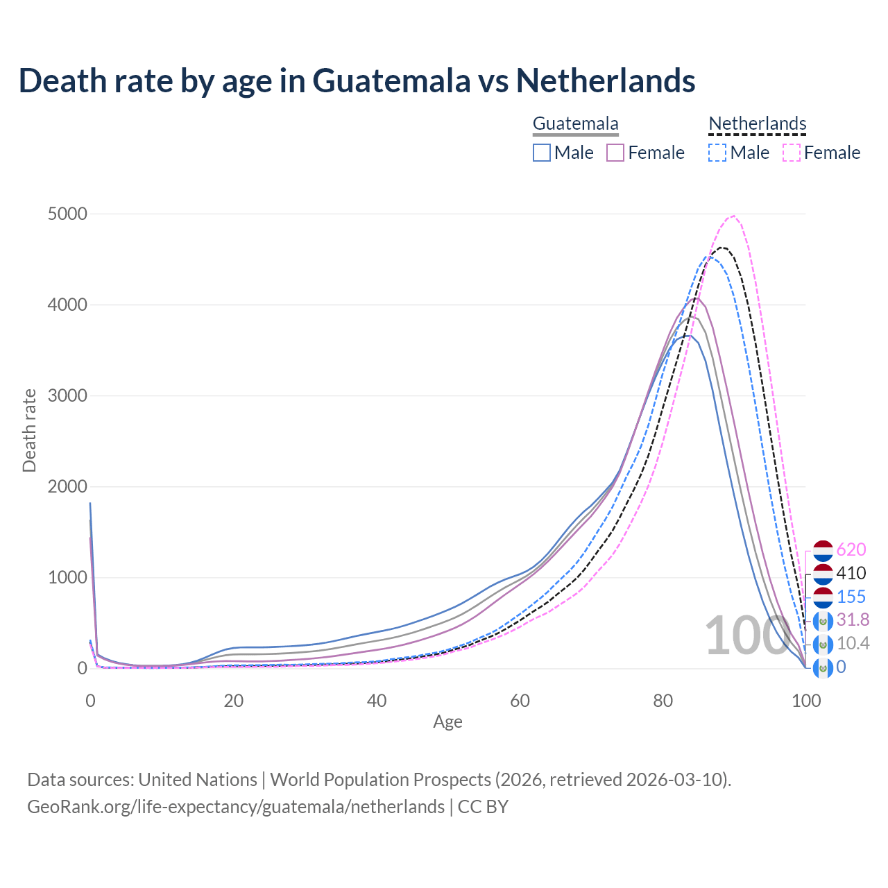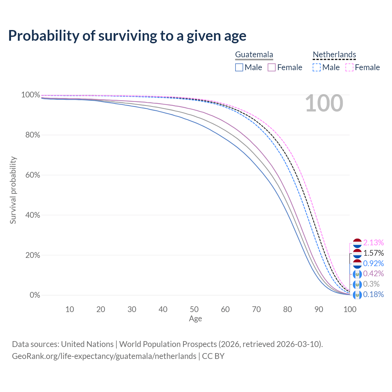 This life expectancy calculator shows the odds of living to 100, 95, 90, and below based on current age for both males and females in Guatemala and the Netherlands, along with mean and median age of death. The calculations are based on the 2026 life tables (actuarial tables) from the UN World Population Prospects.