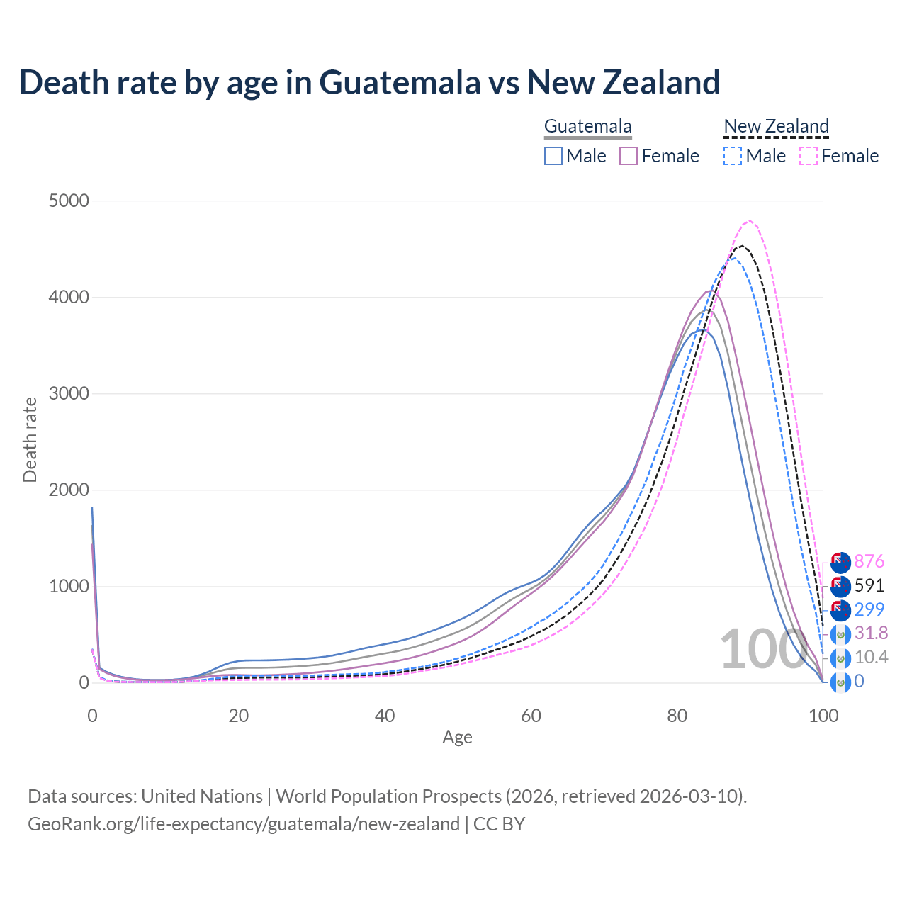 In Guatemala, the most common age of death is 84, compared to 89 in New Zealand. The median age of death is 78.7 in Guatemala and 85.8 in New Zealand, meaning only half of each cohort is expected to live past that age.