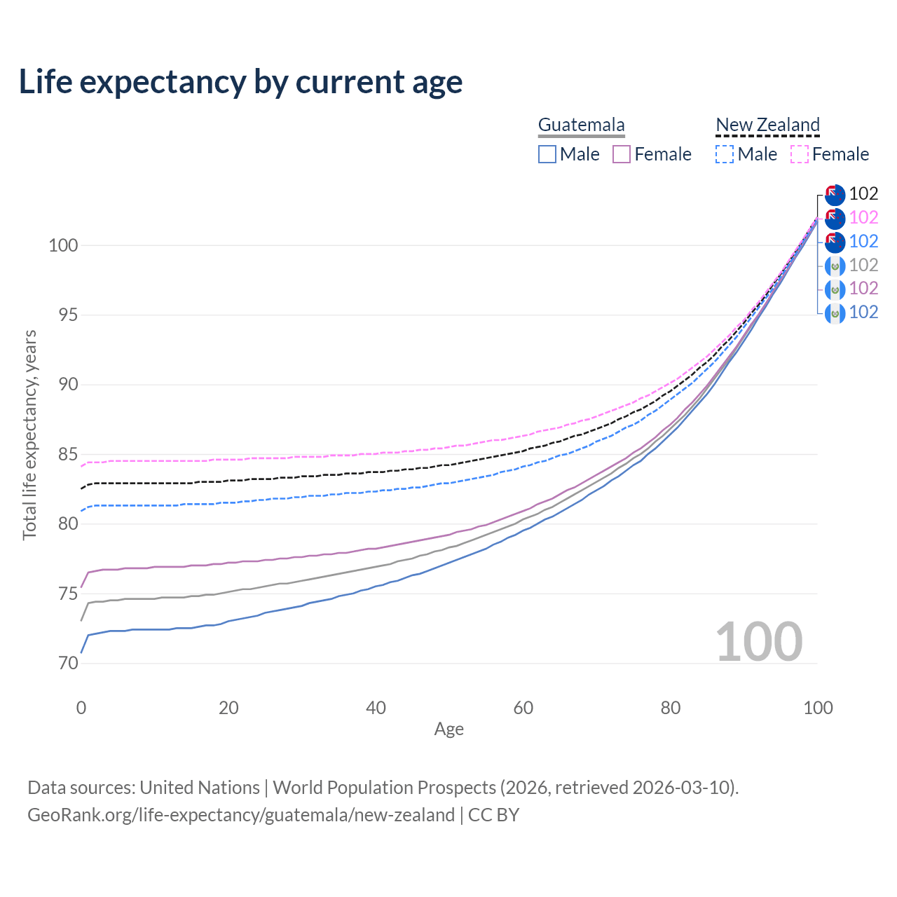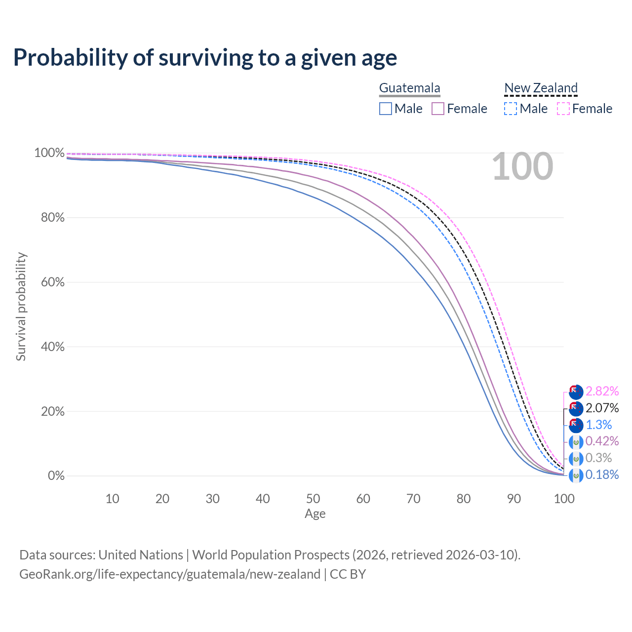 This life expectancy calculator shows the odds of living to 100, 95, 90, and below based on current age for both males and females in Guatemala and New Zealand, along with mean and median age of death. The calculations are based on the 2026 life tables (actuarial tables) from the UN World Population Prospects.