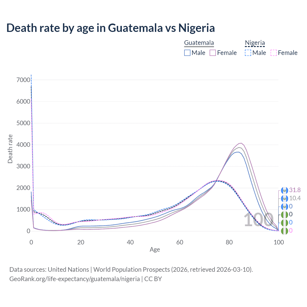 In Guatemala, the most common age of death is 84, compared to 0 in Nigeria. The median age of death is 78.7 in Guatemala and 64.3 in Nigeria, meaning only half of each cohort is expected to live past that age.