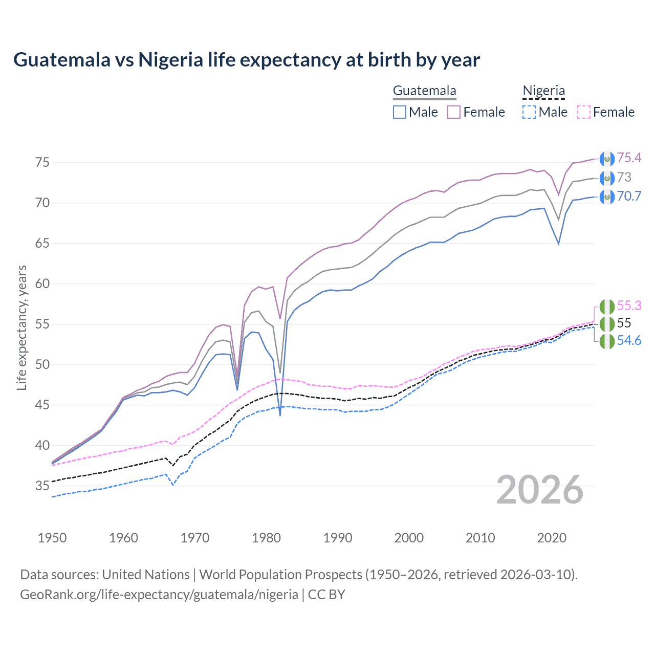 The average life expectancy at birth is 73 years in Guatemala vs 55 in Nigeria. Guatemala is ranked 113/197 by life expectancy, and Nigeria is 197/197. In Guatemala, the life expectancy is 70.7 years for males and 75.4 years for females. In Nigeria, it's 54.6 years for males and 55.3 years for females.