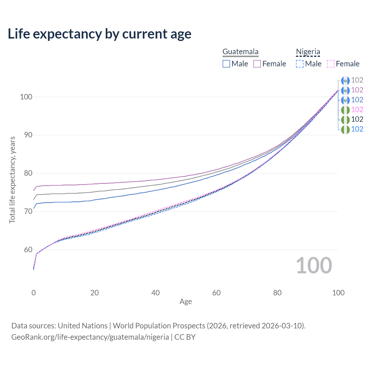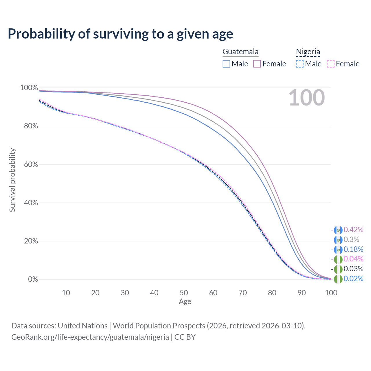 This life expectancy calculator shows the odds of living to 100, 95, 90, and below based on current age for both males and females in Guatemala and Nigeria, along with mean and median age of death. The calculations are based on the 2026 life tables (actuarial tables) from the UN World Population Prospects.
