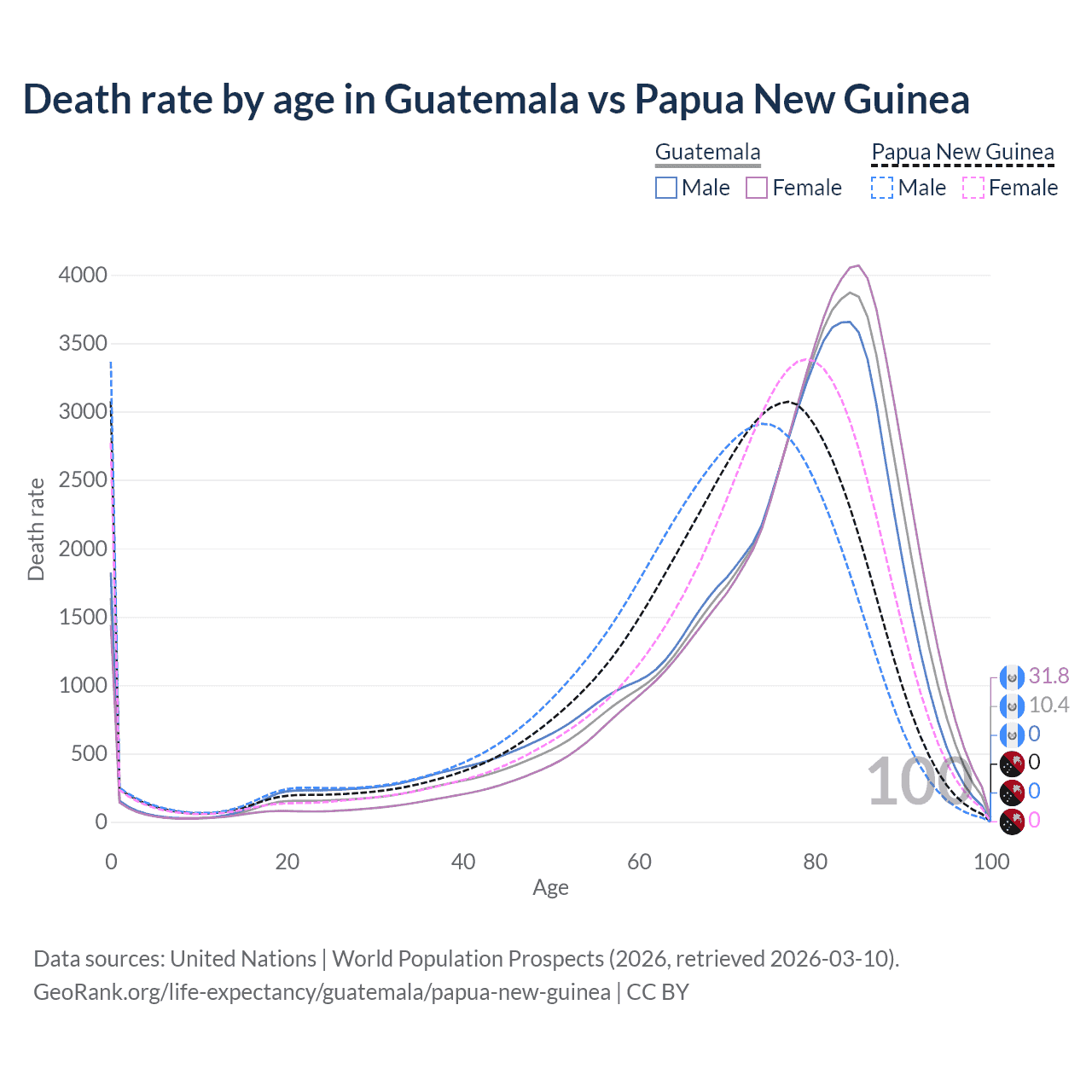 In Guatemala, the most common age of death is 84, compared to 0 in Papua New Guinea. The median age of death is 78.7 in Guatemala and 71.7 in Papua New Guinea, meaning only half of each cohort is expected to live past that age.