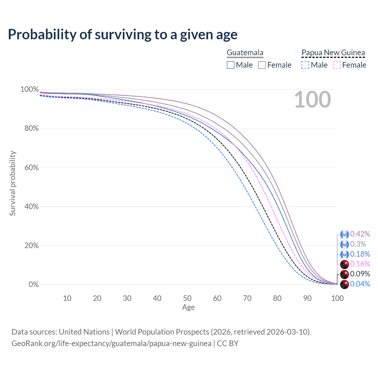 This life expectancy calculator shows the odds of living to 100, 95, 90, and below based on current age for both males and females in Guatemala and Papua New Guinea, along with mean and median age of death. The calculations are based on the 2026 life tables (actuarial tables) from the UN World Population Prospects.